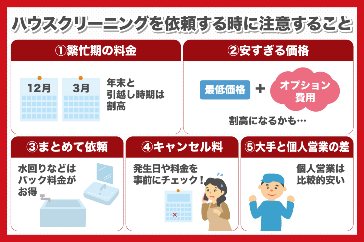 ハウスクリーニングを依頼する場合は、費用に対しいくつか注意が必要です。場所別や広さ別の費用相場に当てはまらない場合もあるため注意しましょう。