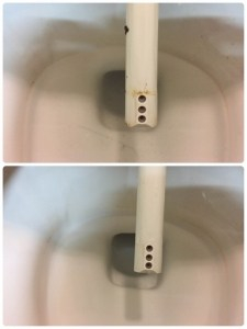 ウォシュレットノズルは本体から引き出し、固まってしまった尿石汚れなども専用洗剤とスポンジで削り落とします!