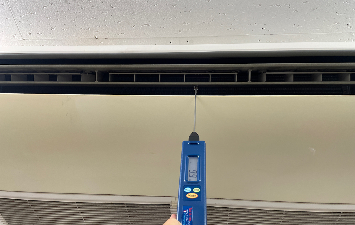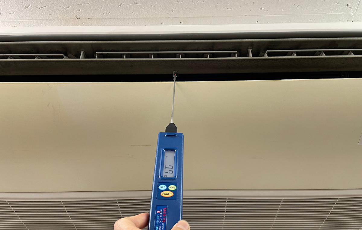 『測定結果』 設定温度:27℃ 吹出温度:9.9℃ でした。(クリーニング後も測定します。)