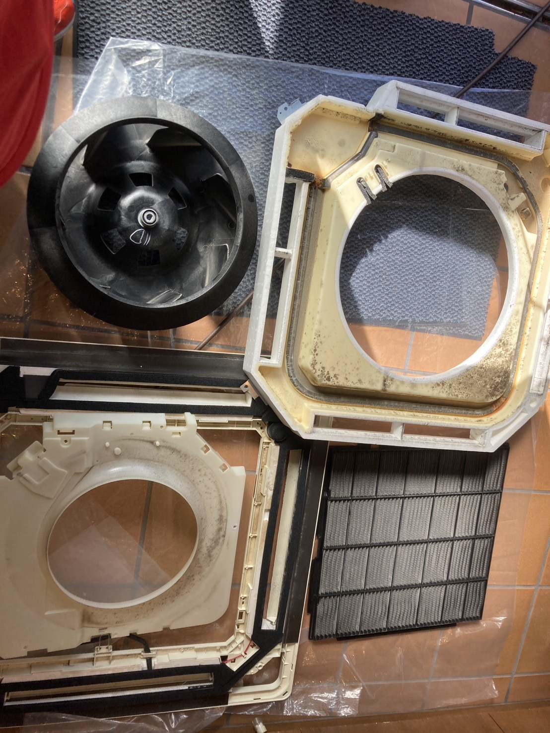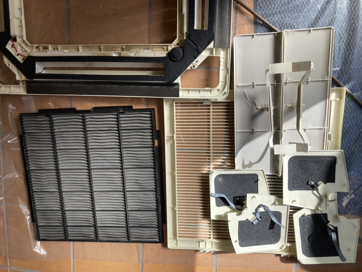 作業当日は、備品の養生からスタートし、エアコンのパネルやフィルター、ファン、ドレンパンを順に分解してきました。
