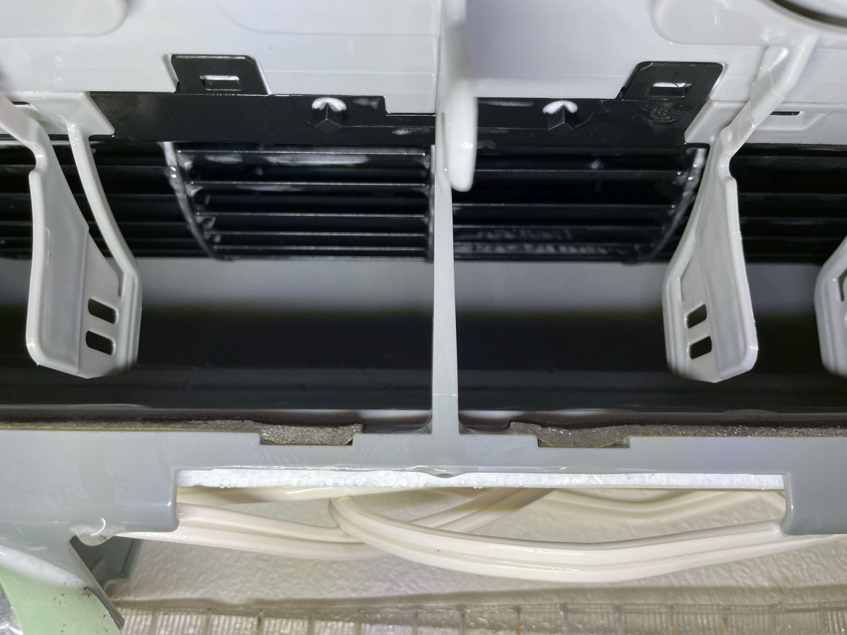 キッチン横のエアコンの内部状況を確認してみると油がびっしり。