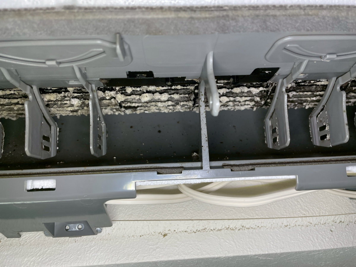 時間が経てば経つほど、埃と油が固まってカチカチに…。こうなると、エアコンの効きが悪くなるだけでなく、嫌な臭いやカビの温床にもなってしまいます。
