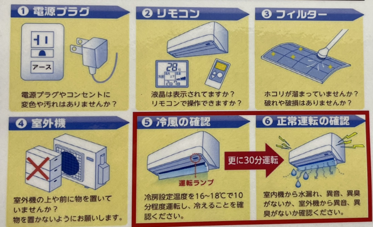お客様へ『エアコン運転』エアコンクリーニング前に確認してください。
