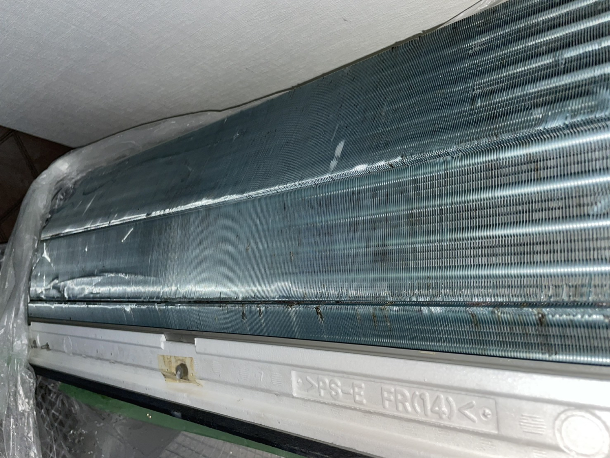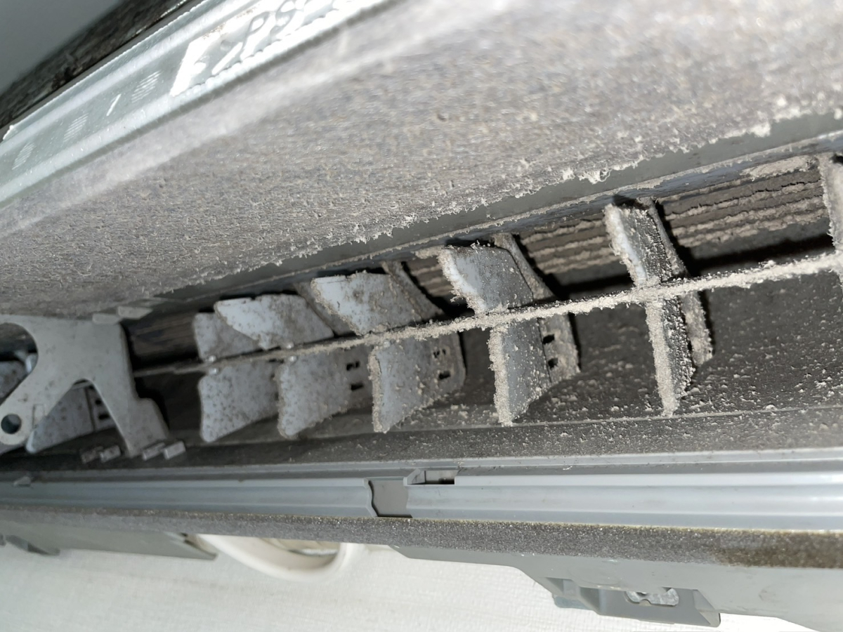 お客様にご案内されながら、エアコンを目の前にして分解する間もなく・・・。ん?汚れが目立っていると思いました。
