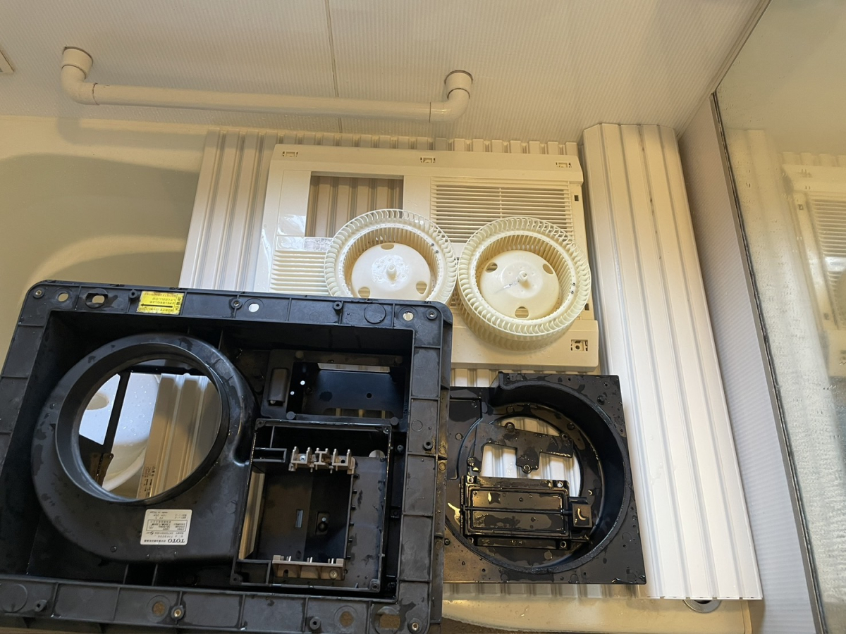 クリーニングでは天井から本体を取り外し、カバー・ファン・基盤周辺・ヒーター部分などを分解し、手の届かない内部までしっかり洗浄します。