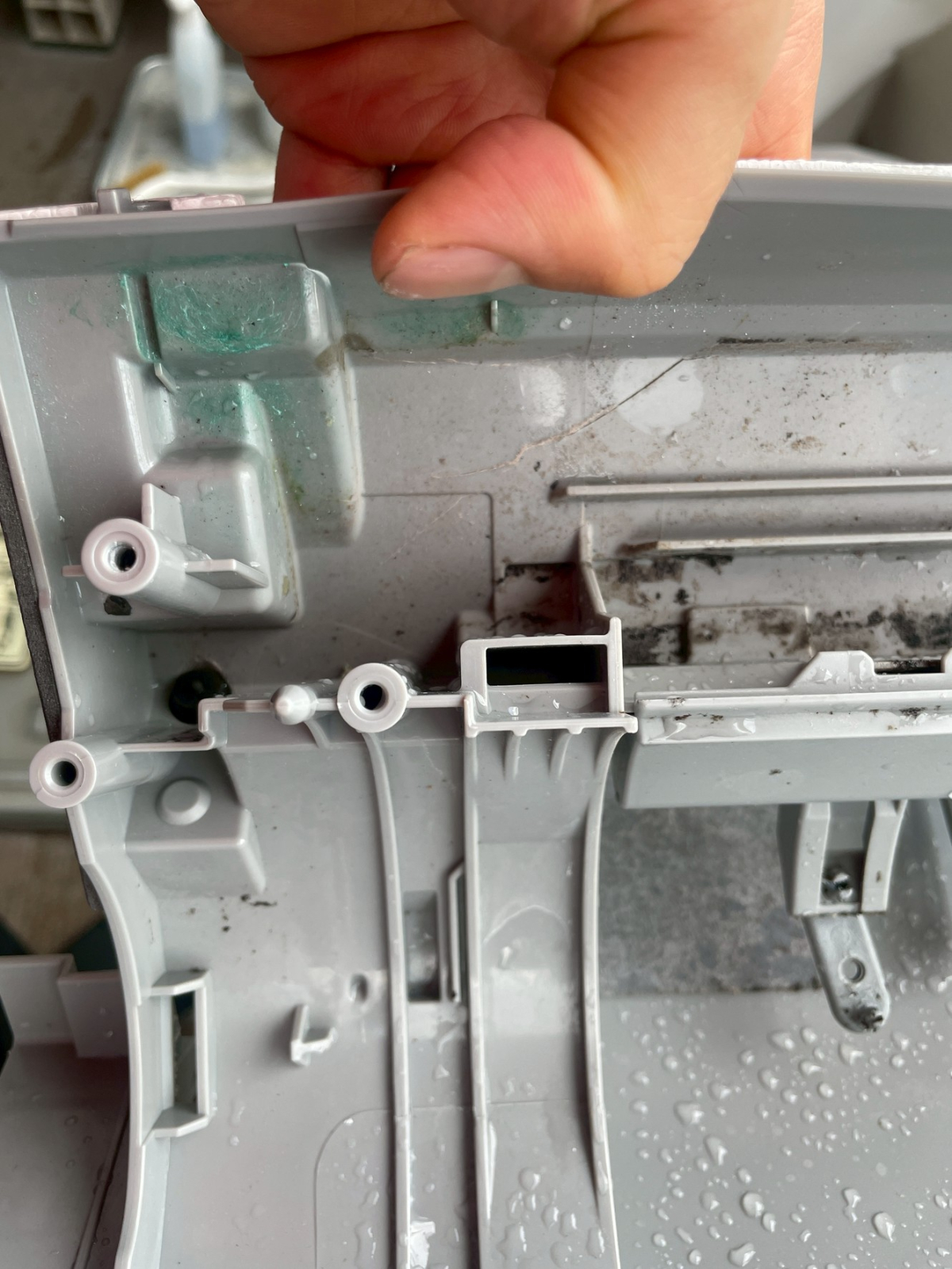 『ドレンパン』普段は目にすることのない部品ですが、この部分にひび割れが入ってしまうと水漏れトラブルの大きな原因になります。