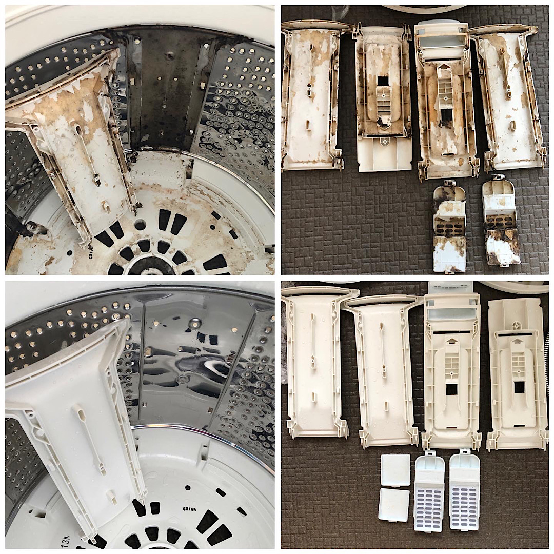 クリーニングでは、洗濯槽だけなく、洗濯機の内部や細かいパーツを外せるだけ外して、丁寧に洗っていきます。