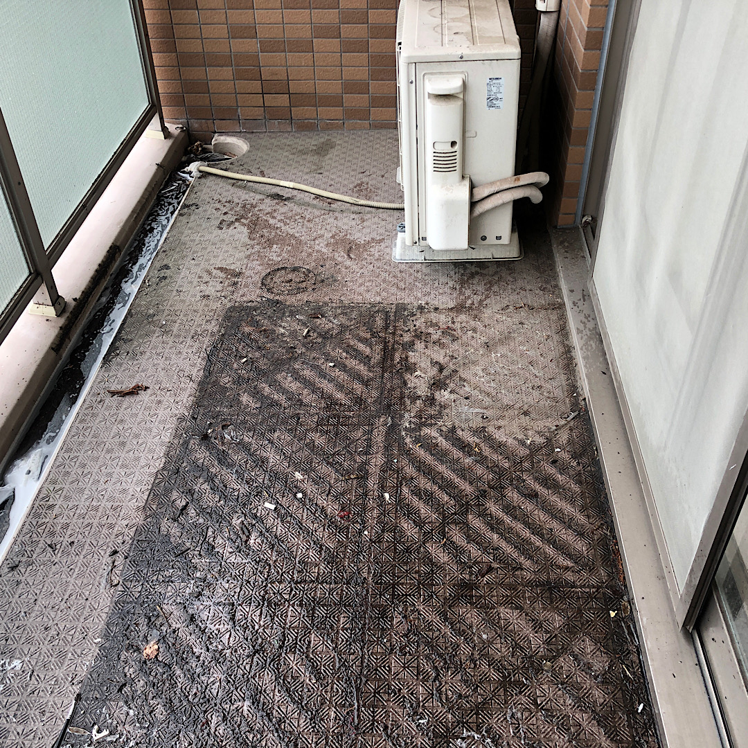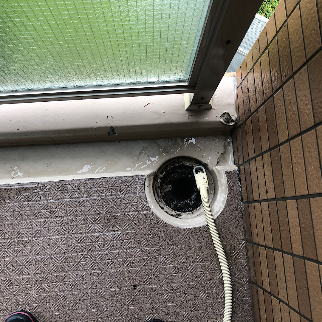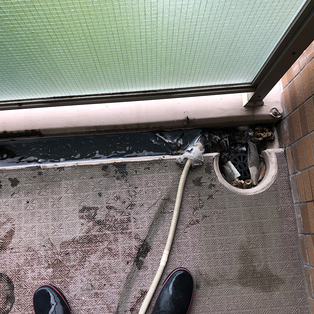 お掃除のやり方がわからない方は、こんな感じでベランダが汚れていることが多いです。そして、一度もやっていないと排水口の水はけも悪くなっていることもあります。