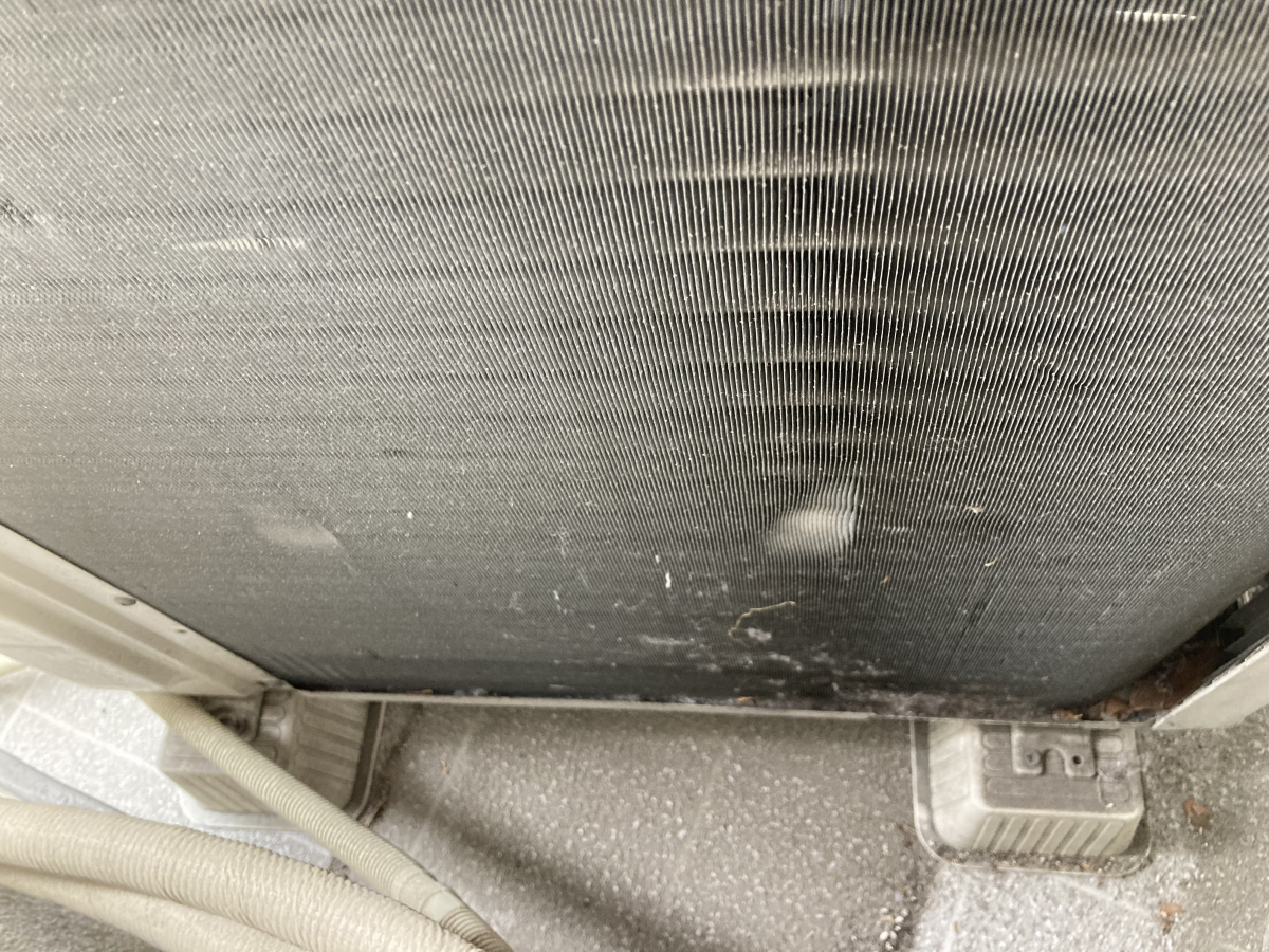 室外機の裏側は室内機と同じにアルミフィンになっていますので、そこにホコリが詰まっていたり、葉っぱなどが付いていると、室内機に上手に力が伝えられないという状況になってしまいます!
