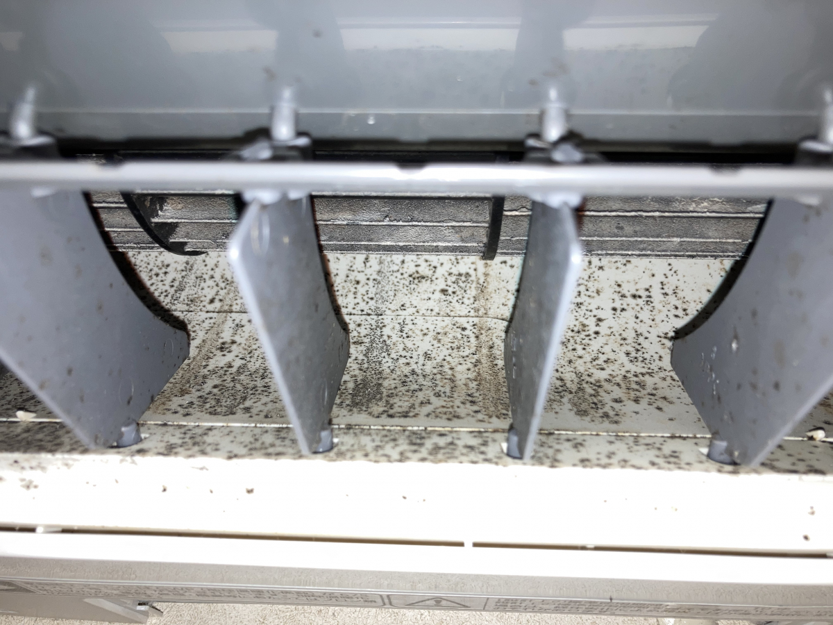 アルミフィンにはホコリがビッシリ、送風ファンは黒カビだらけ、これを見ているとお掃除機能がいかに必要がないという事がわかりますね(-。-;