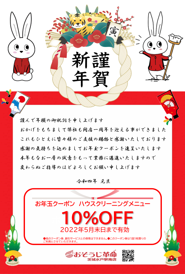 只今おそうじ革命茨城水戸駅南店の年賀状をお持ちの方に、10%OFFのクーポンがついております♪