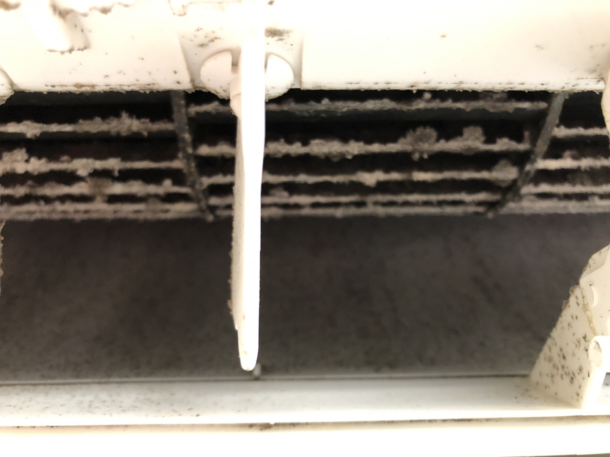 このエアコンはパン屋さんの作業場に設置されているもので、1年間毎日使用+パンの粉などが入り込んでしまうため、カビなども発生しやすいのです。