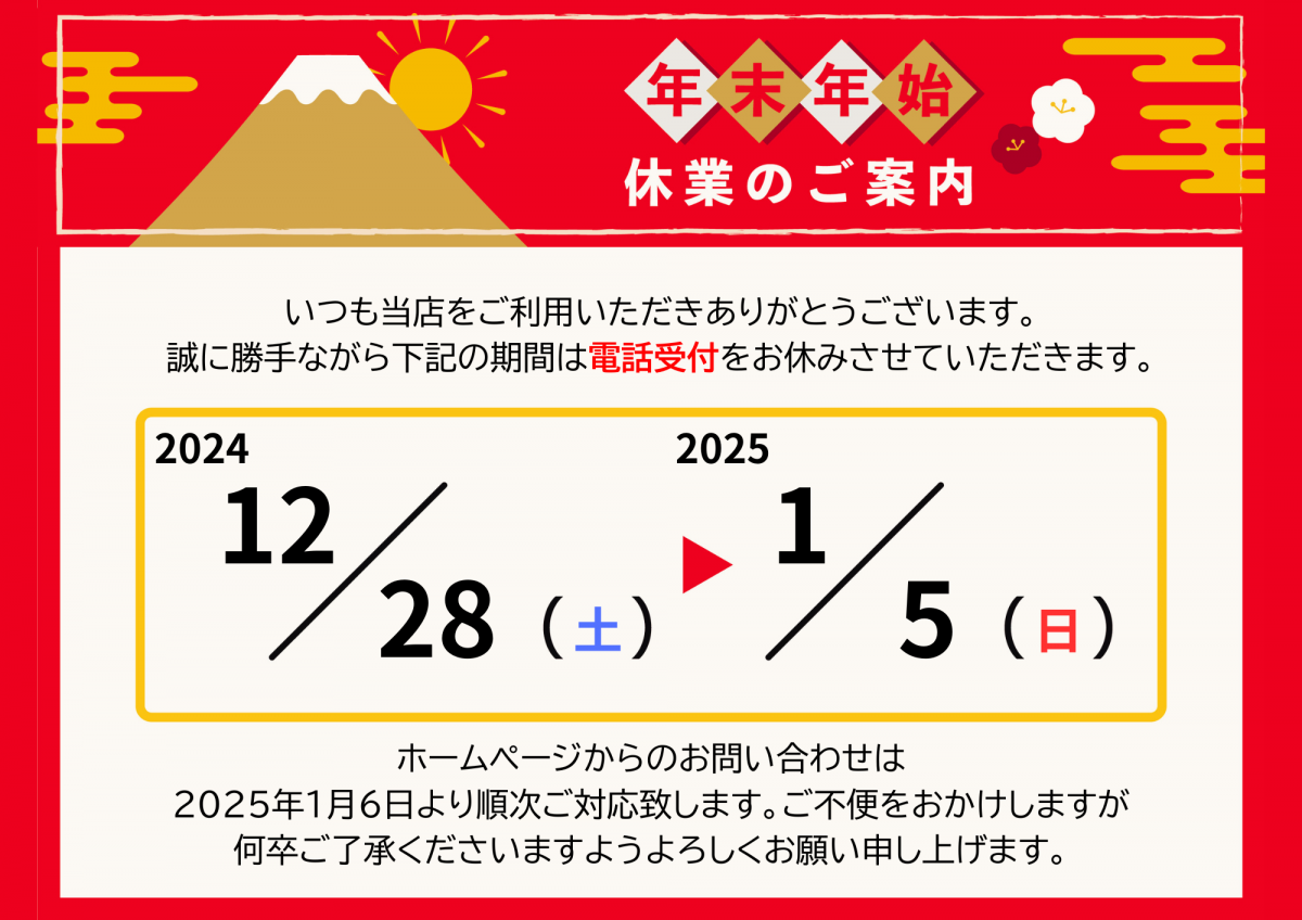 誠に勝手ながら、12/28~1/5まで電話受付をお休みとさせていただきます。