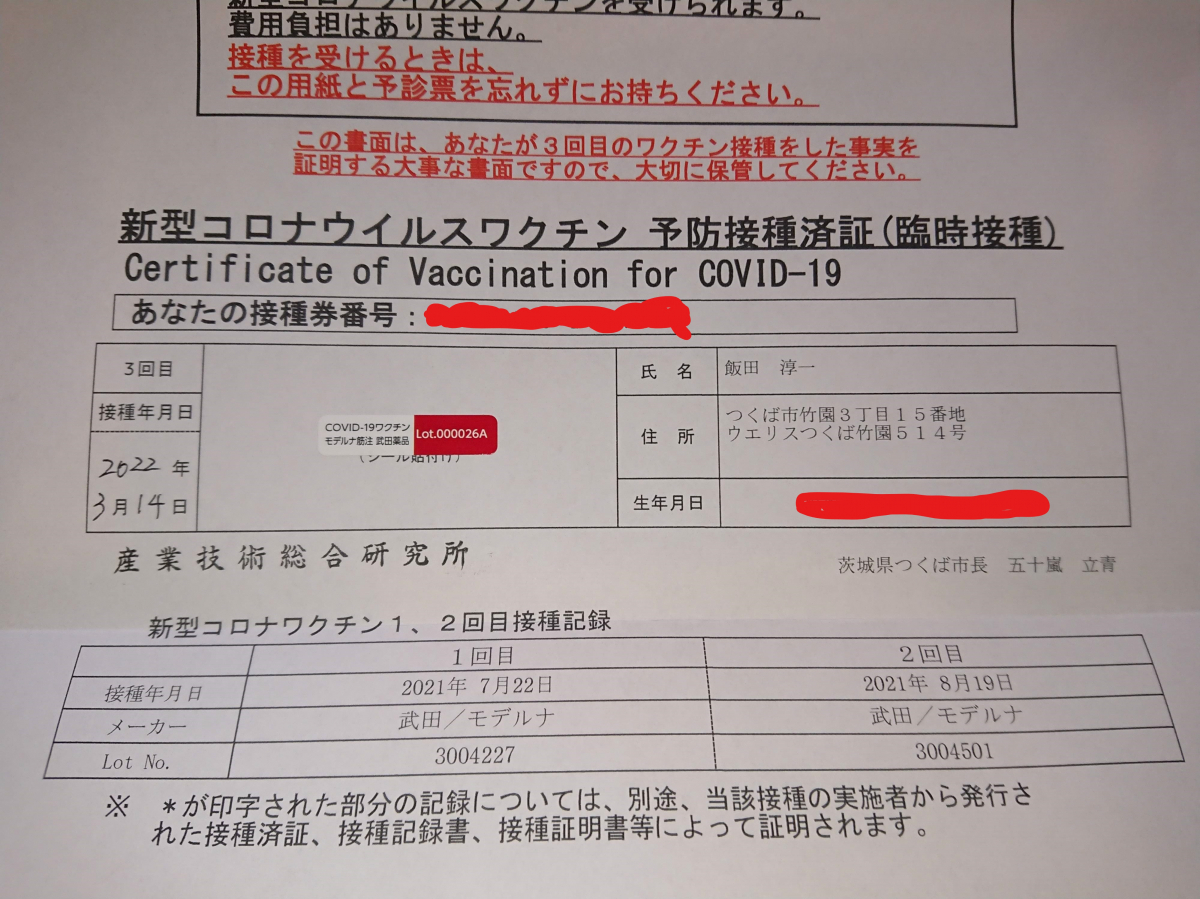 3/14に3回目の新型コロナウイルスワクチン接種を完了しました。