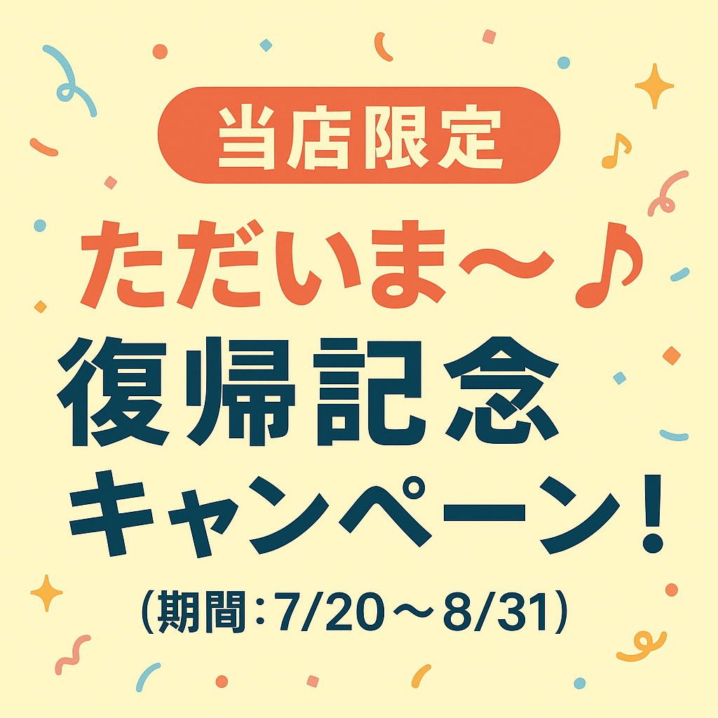 【当店限定】ただいま~♪復帰記念キャンペーン!(期間:7/20~8/31)