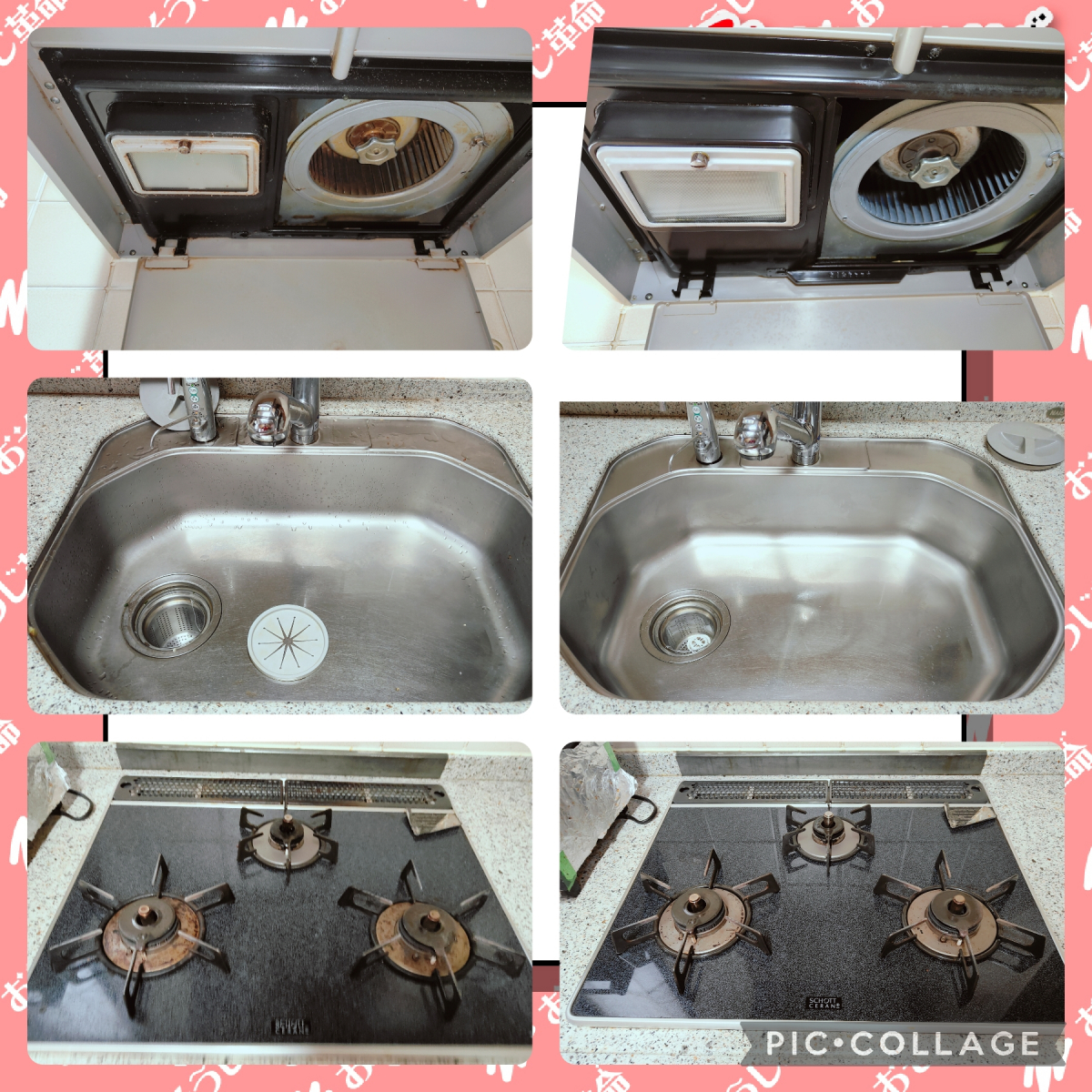 今回清掃させていただいたのはレンジフード、キッチン、洗面、浴室+追い焚き、天埋エアコンでした。