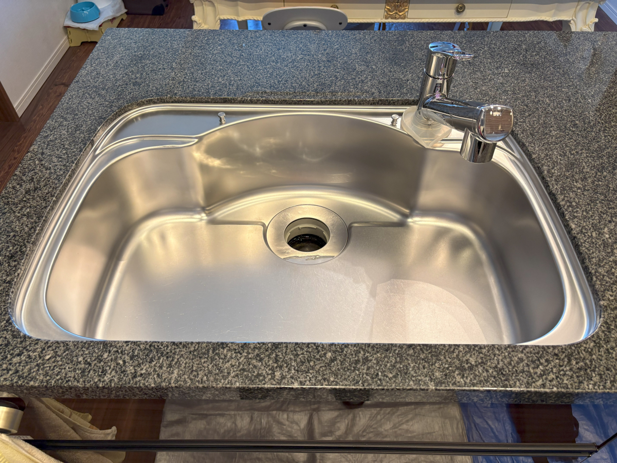 薬剤を使い油汚れや水垢を落とした後にシンクをピカピカに磨き上げました。