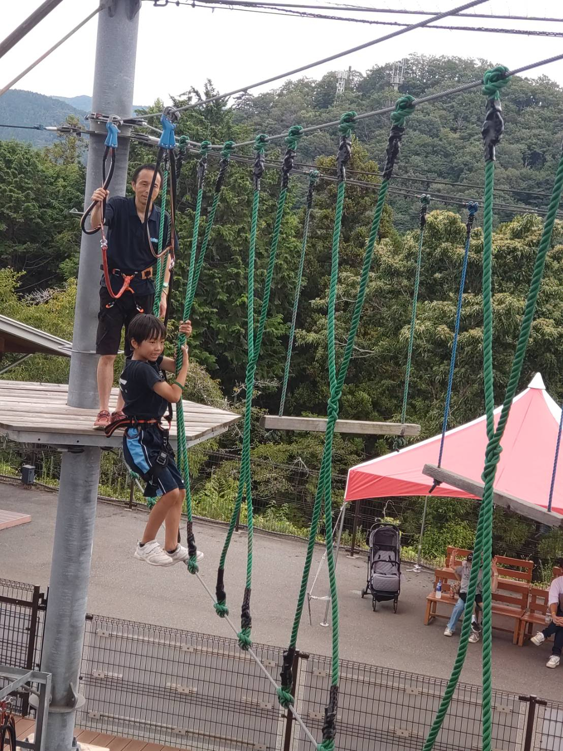 高所で落下防止用のハーネスをつけて行うアスレチックで、とにかく全身の筋肉をつかうアトラクションでした。