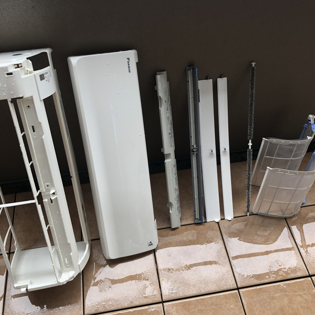 ホコリを撒き散らさないように気をつけながら分解して、今回はベランダで分解パーツを洗わせていただきました。
