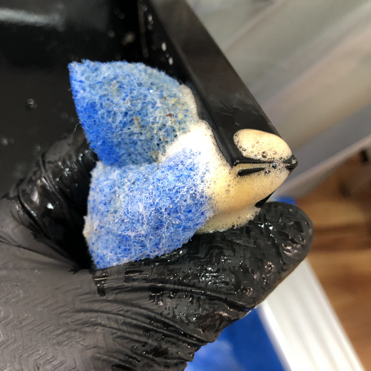 軽く擦るだけではとれないものでも、薬剤や道具の調整でベタベタがとれました。