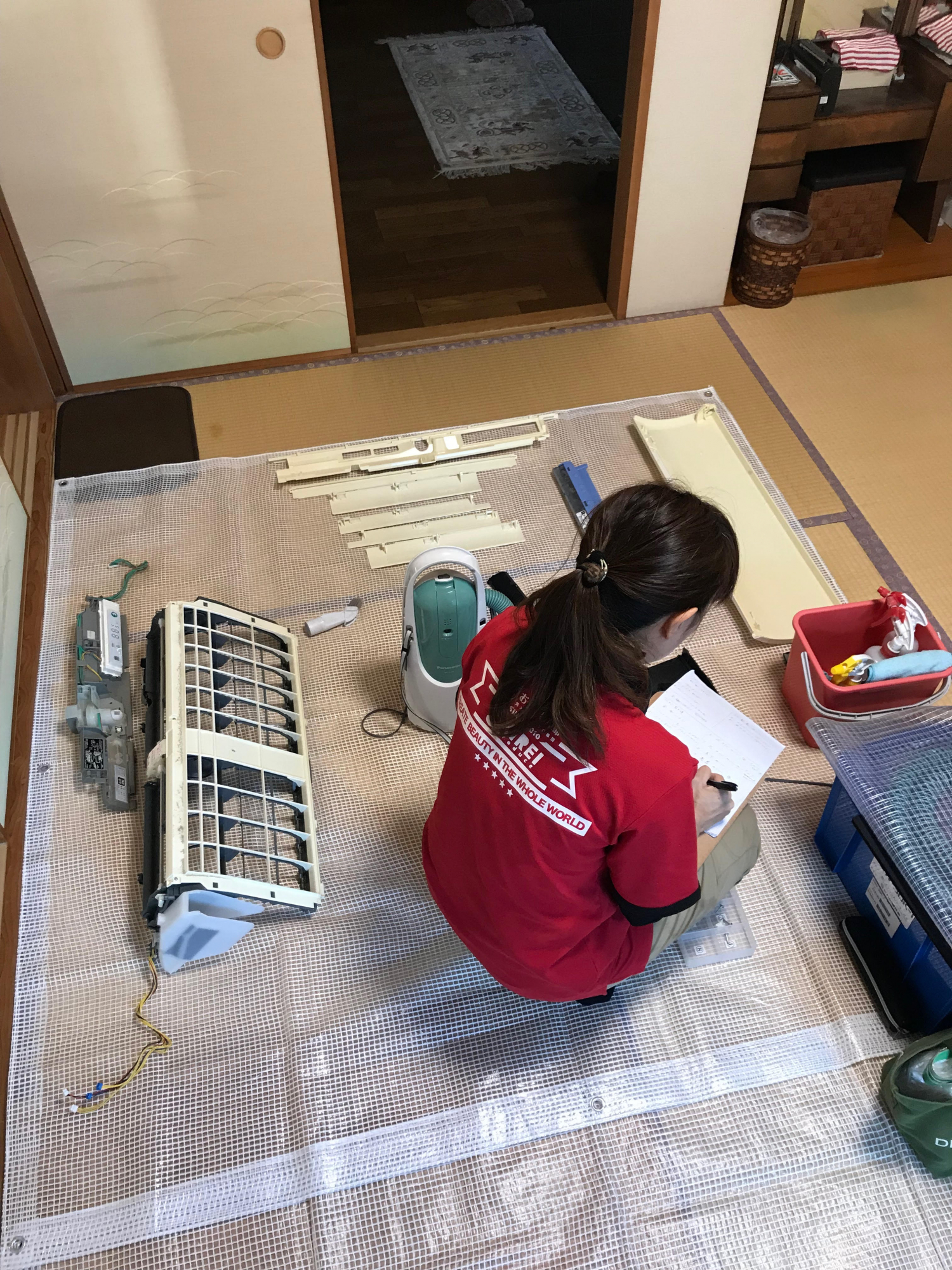 作業前に動作を確認し、周囲を養生で保護します。その後ドライバーでネジを外し、高圧洗浄できるようエアコンを分解していきます。