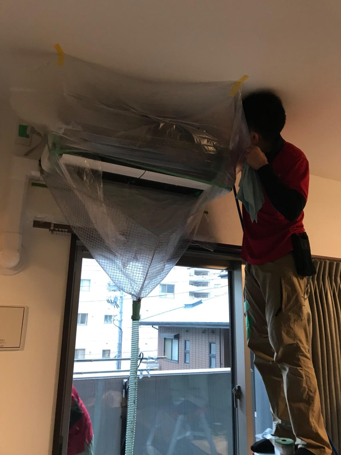 2、新たに正面部分の養生作業を行い、左右から、アルミフィンの裏側をクリーニングする。