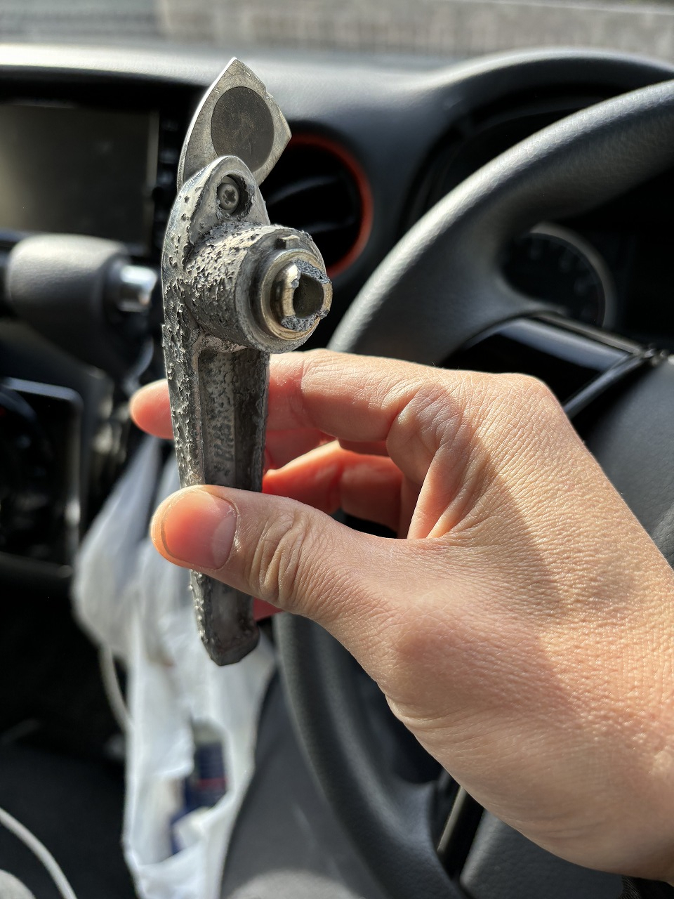 先日、分電盤をあけようと金属のレバーを回したら、ポキッといってしまいました。