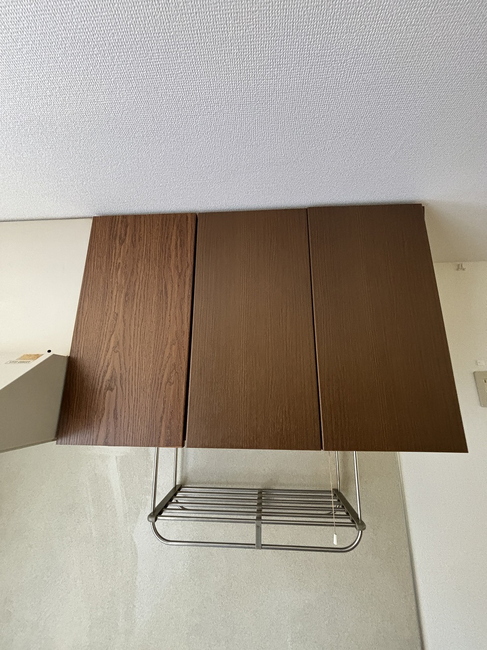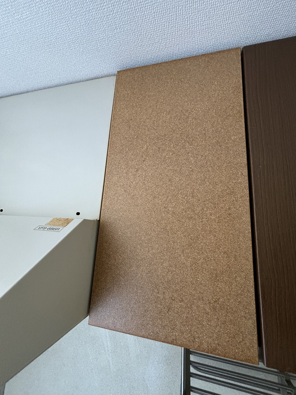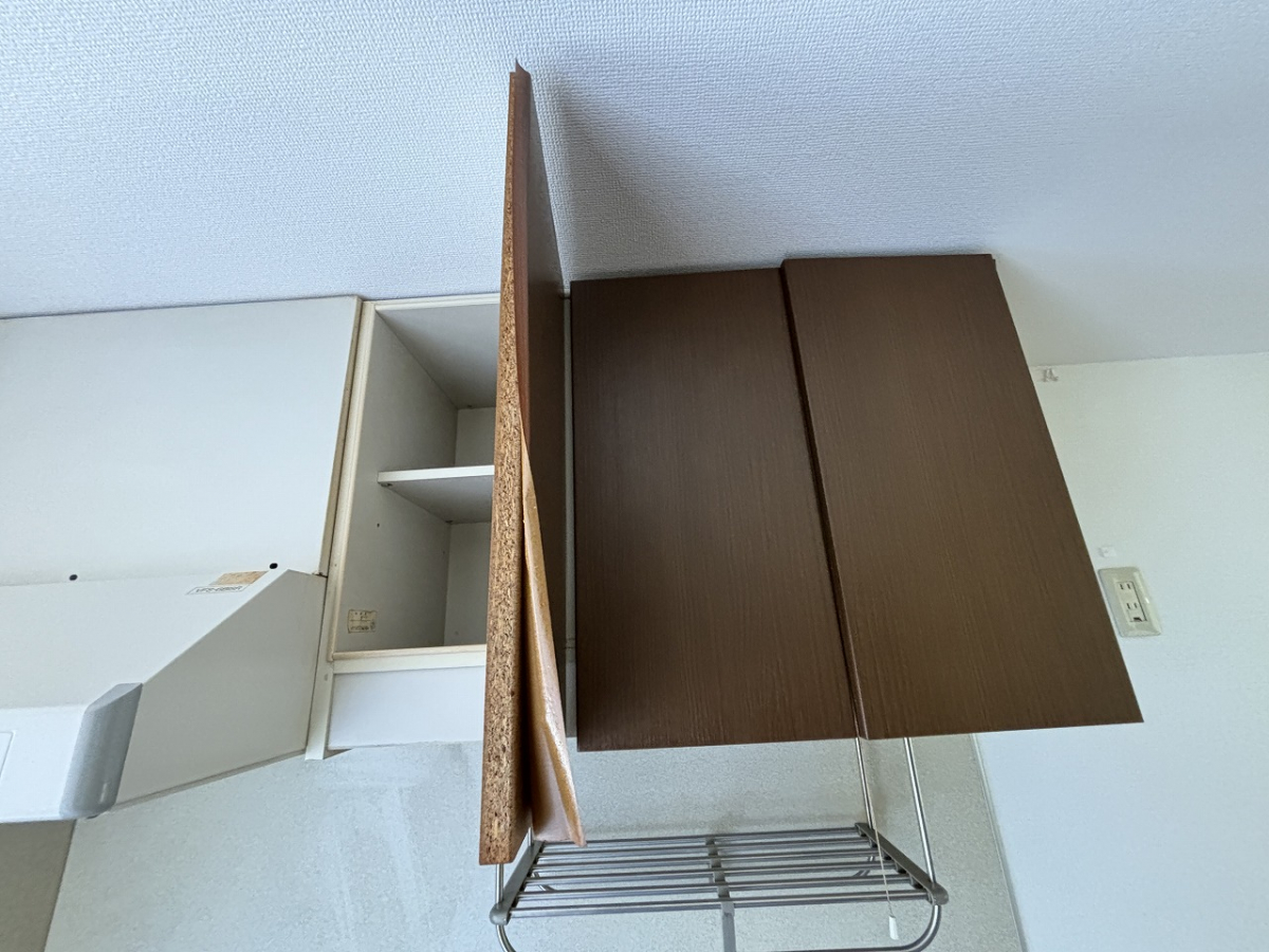 先日の空室清掃の際に、キッチン上の収納扉のクロスが剥がれておりました。