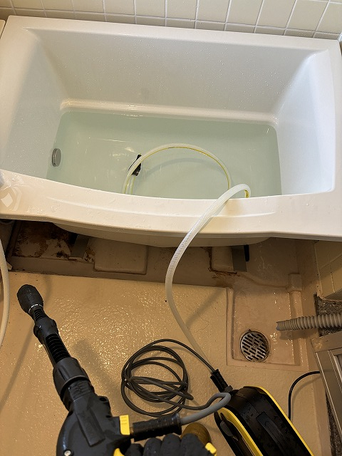 なので塩素系の洗剤を塗布しまくって、高圧洗浄で一気にカビ汚れを取っていく。
