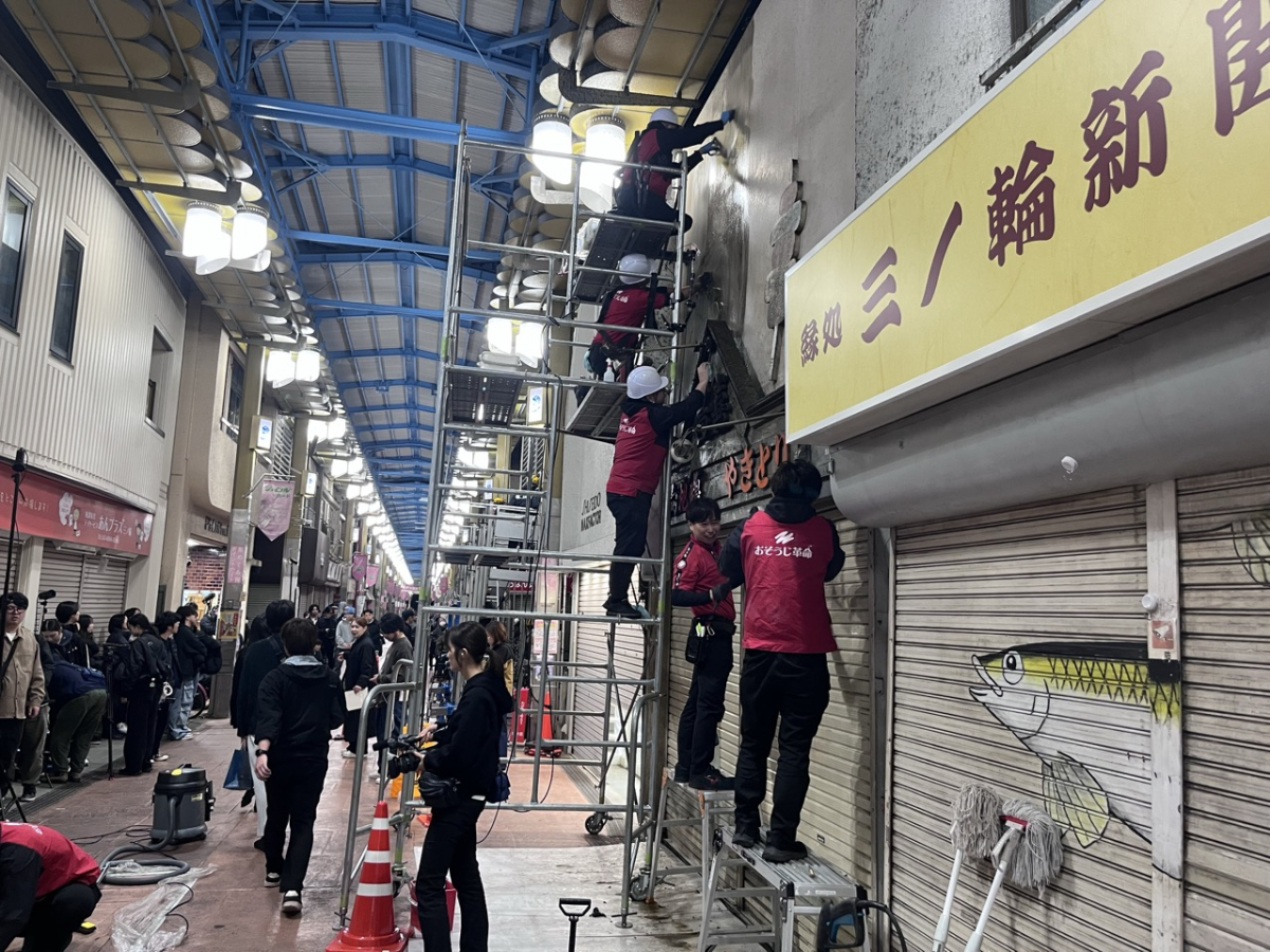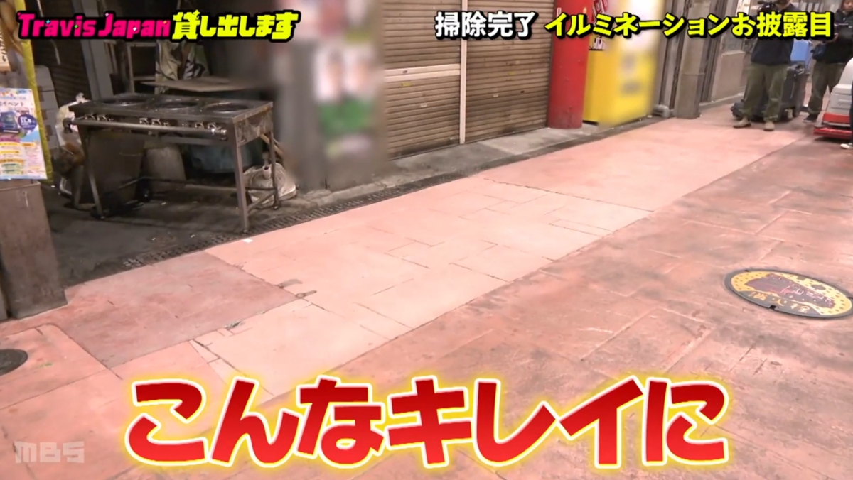 年末年始のかき入れ時を前に、商店街の頑固な汚れをTravisJapanメンバーで一掃しようという企画。