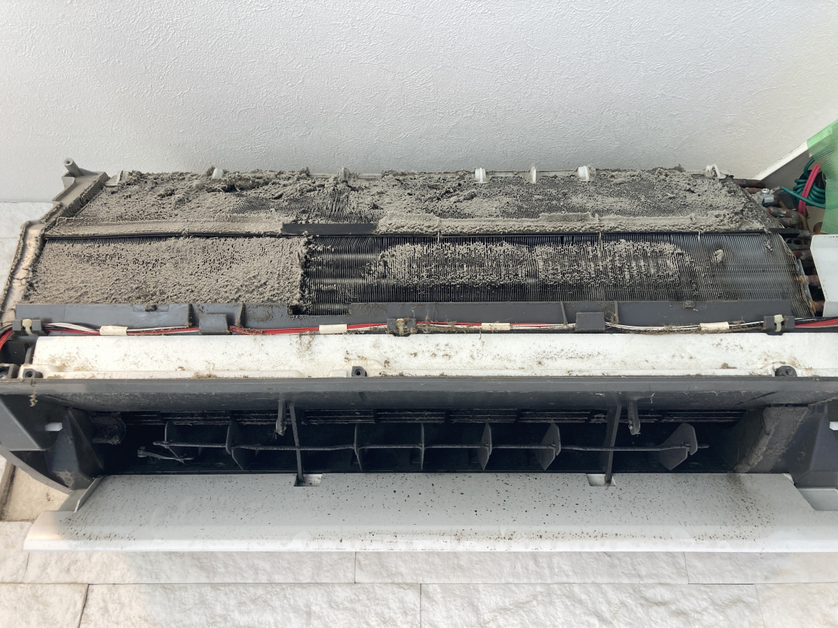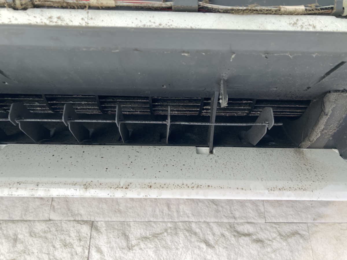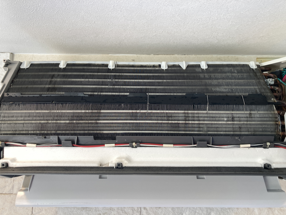 取り外すと熱交換器にも大量のほこりがみてとれます、こちらは専用の洗剤と高圧洗浄機でクリーニングおこないます。