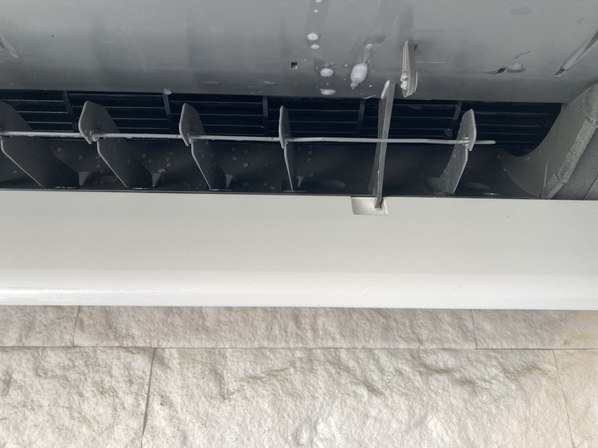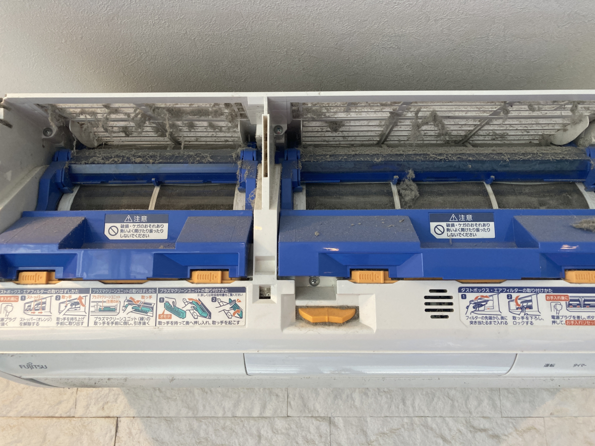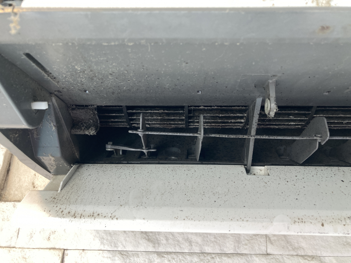 取り外すと熱交換器にも大量のほこりがみてとれます、こちらは専用の洗剤と高圧洗浄機でクリーニングおこないます。
