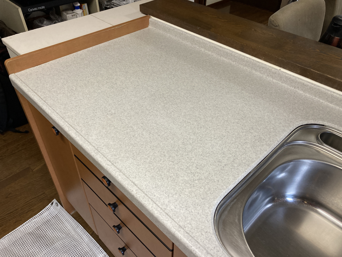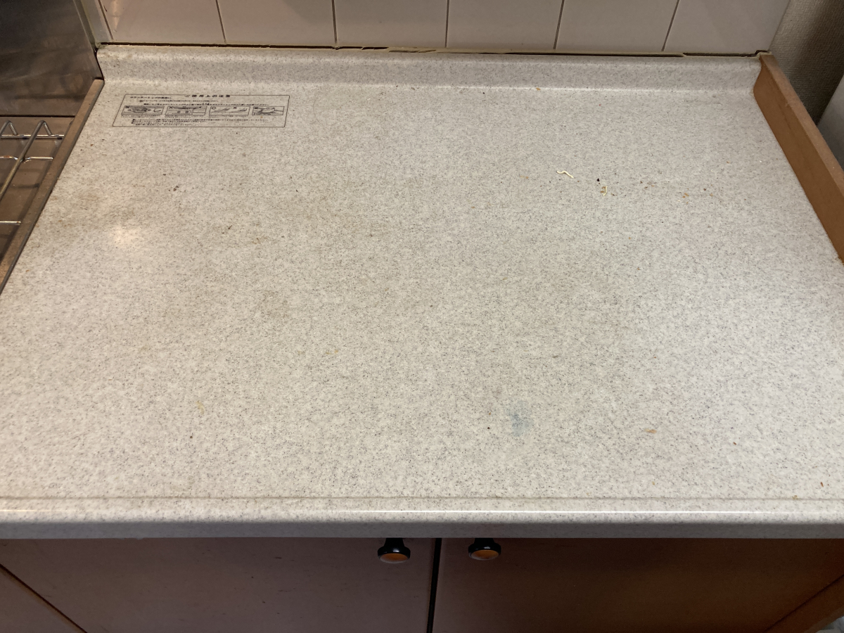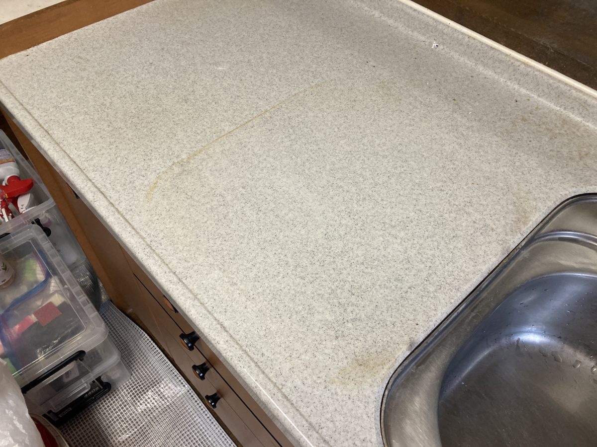 おそうじ革命では汚れに応じて専用の薬剤を使い分けてクリーニングしております。今回のお宅は調理台に茶色い汚れが付着していていました。こちらは表面の汚れを落としてから塩素系洗剤で漂白することで汚れを落としていきます。