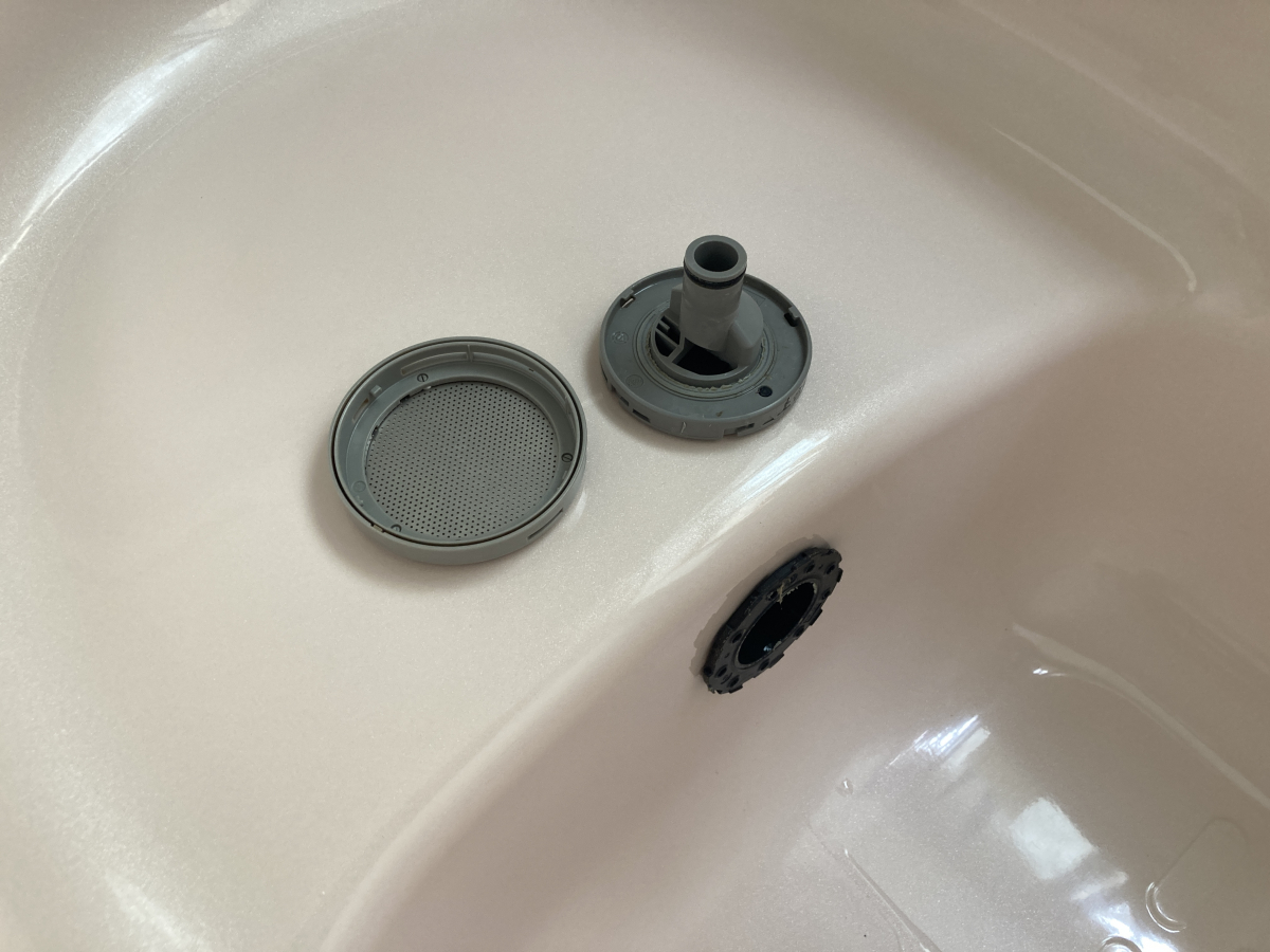 配管内部を洗浄するためにまず循環フィルターを取り外して準備します、循環フィルターの裏側も汚れが付着していることが多いです。こちらのフィルターもクリーニング対象となっております。