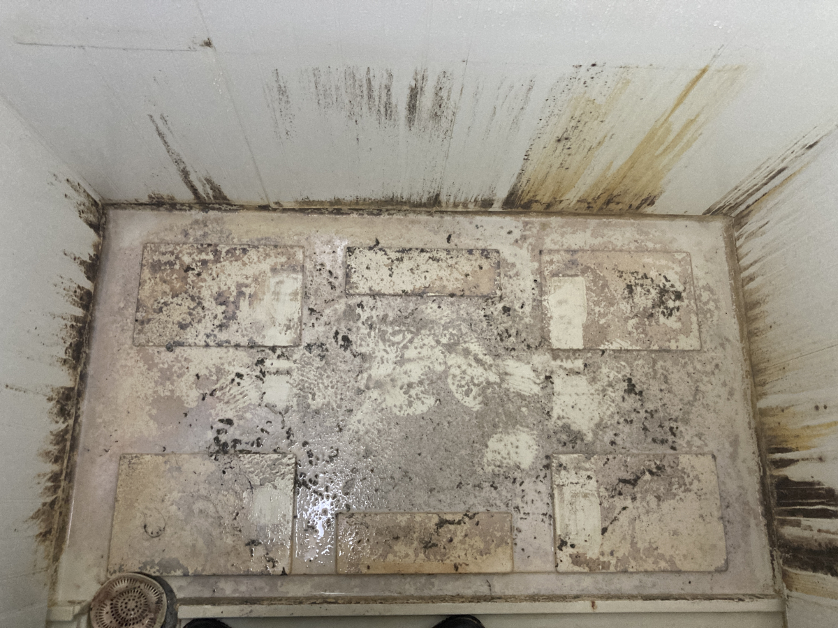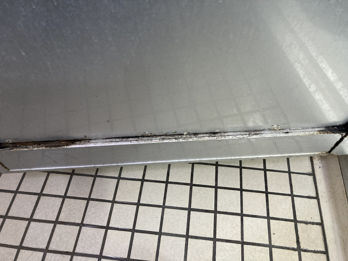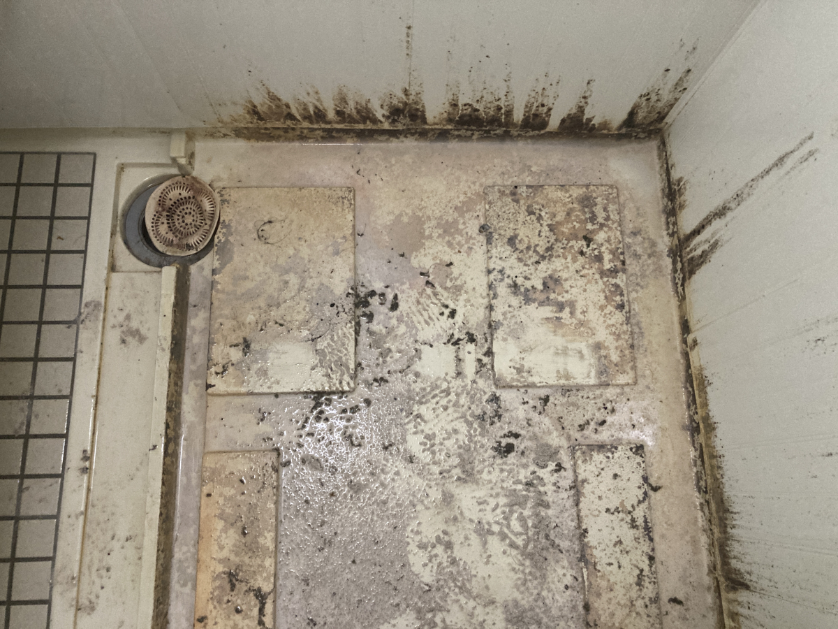 浴室内の壁面にもカビ汚れは付着していましたが、浴槽の裏側や防水パンのような部分は石鹸カス汚れとカビ汚れが大量に積み重なっていました。