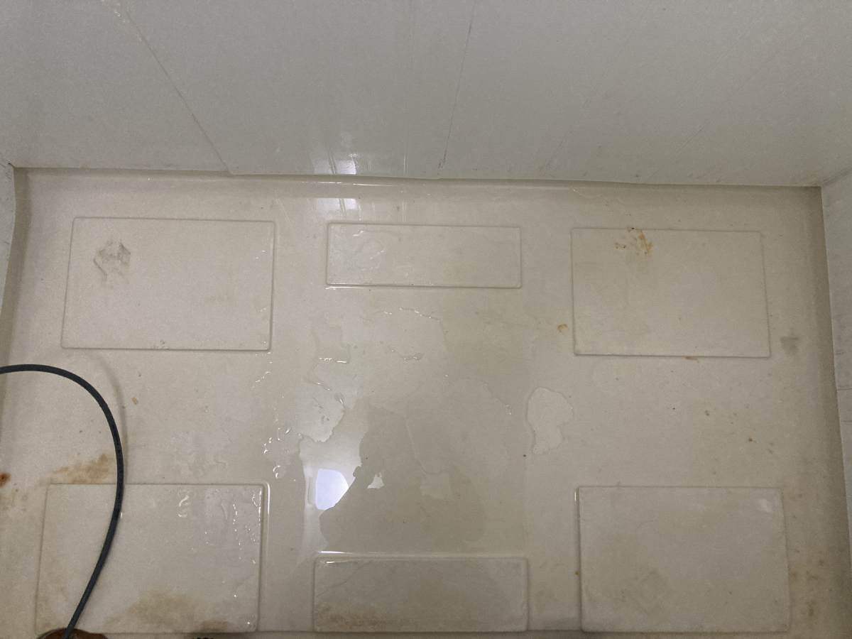 よくあるエプロンが取り外せる浴槽は、エプロンを取り外した上で内部洗浄していますが、エプロンの反対側までは高圧洗浄機も届きません。