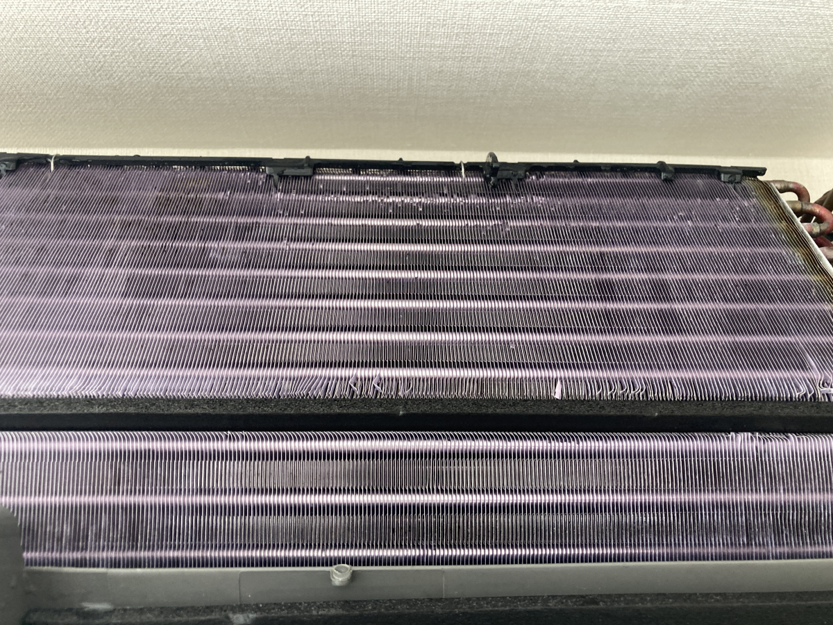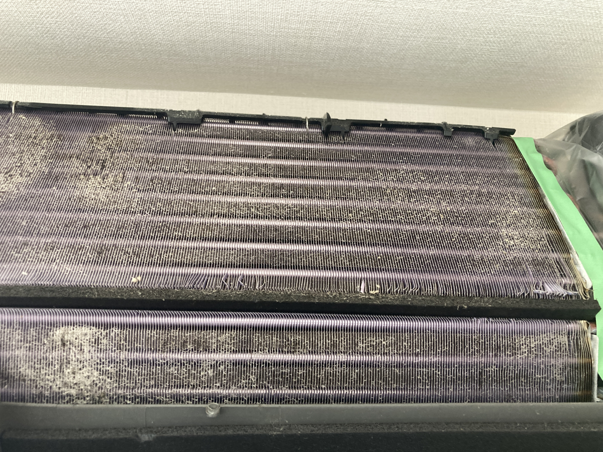 2011年製になります、分解すると熱交換機と呼ばれるアルミフィンは汚れが詰まっているのが見て取れます。