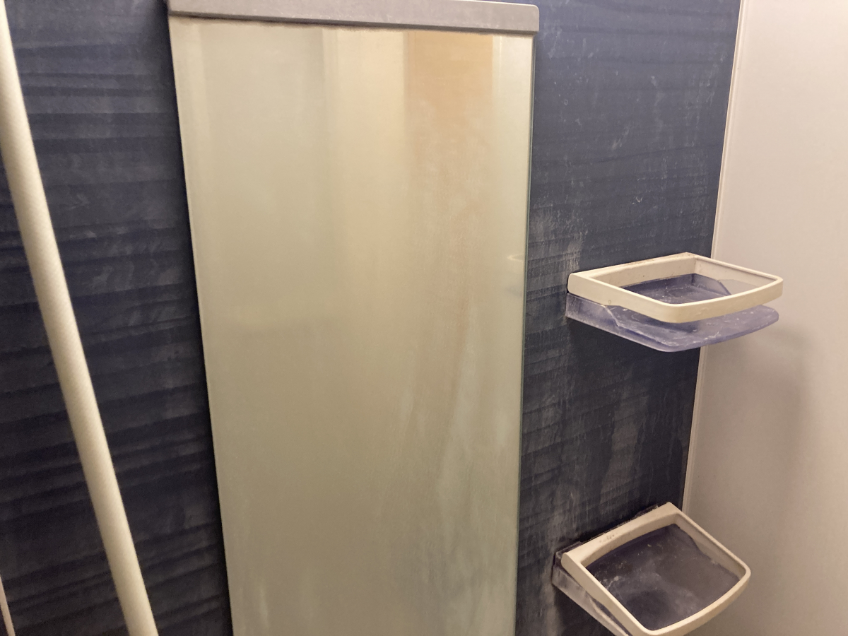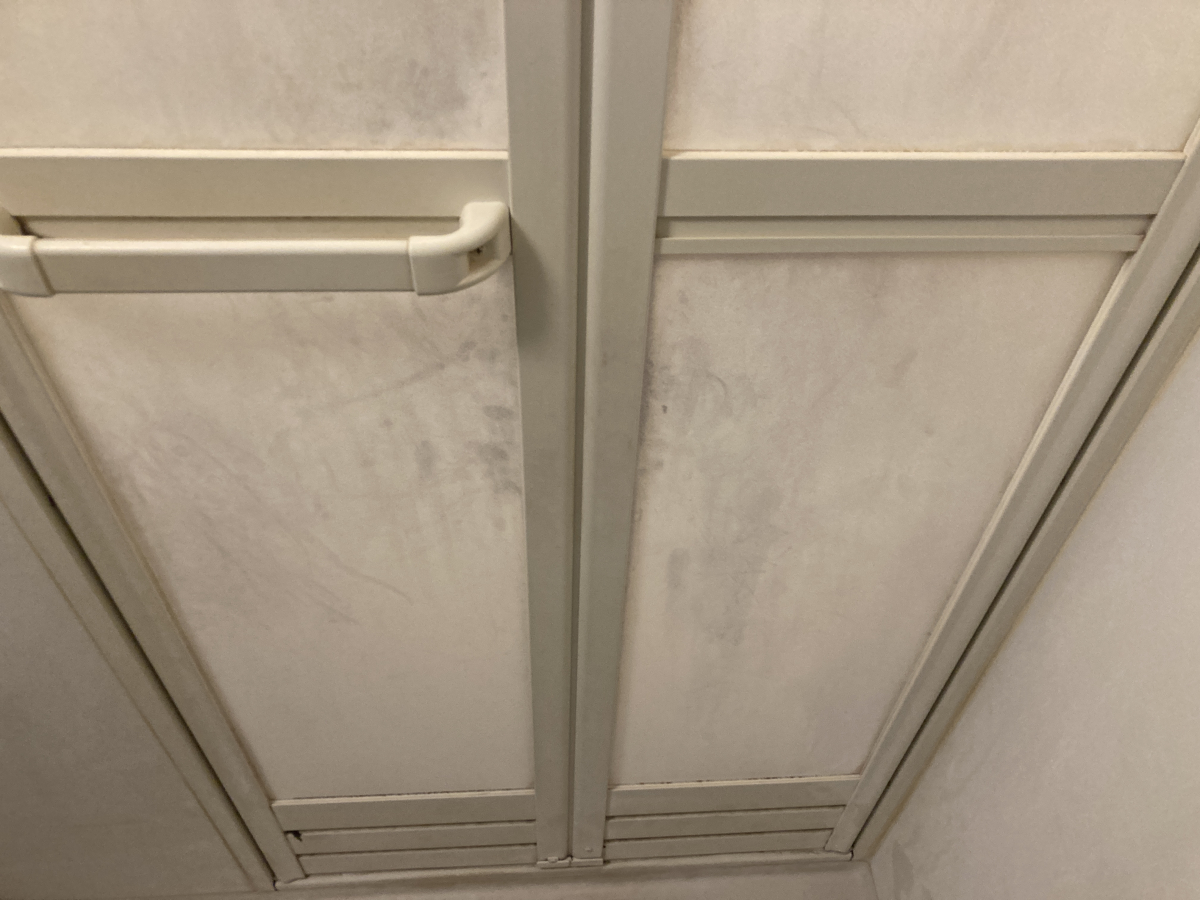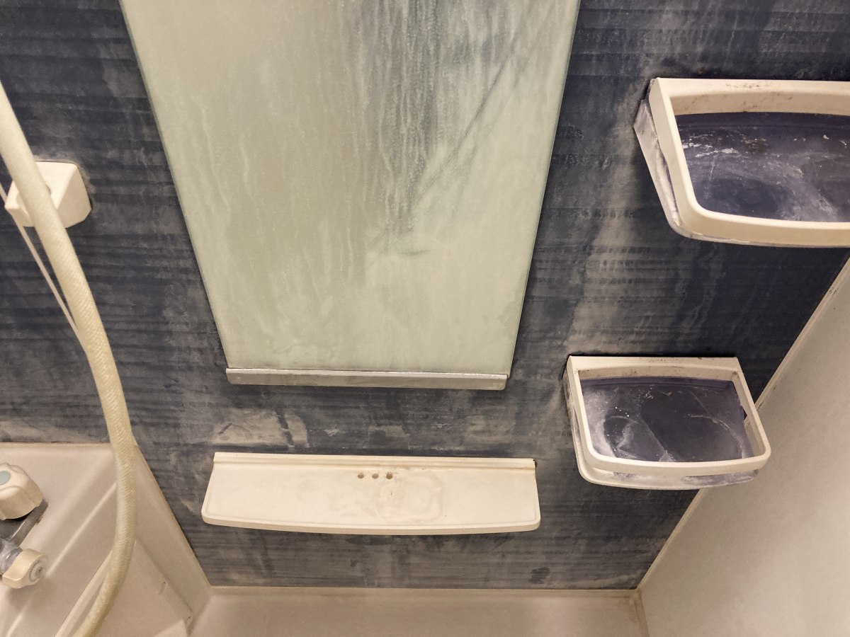ボディーソープより石鹸を使うことが多いようで、シャワーで跳ねた皮脂や石鹼カスが至る所に付着していました。