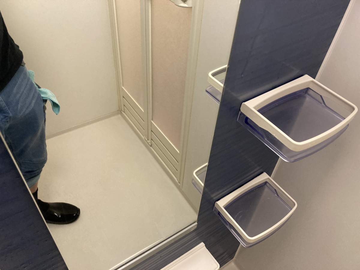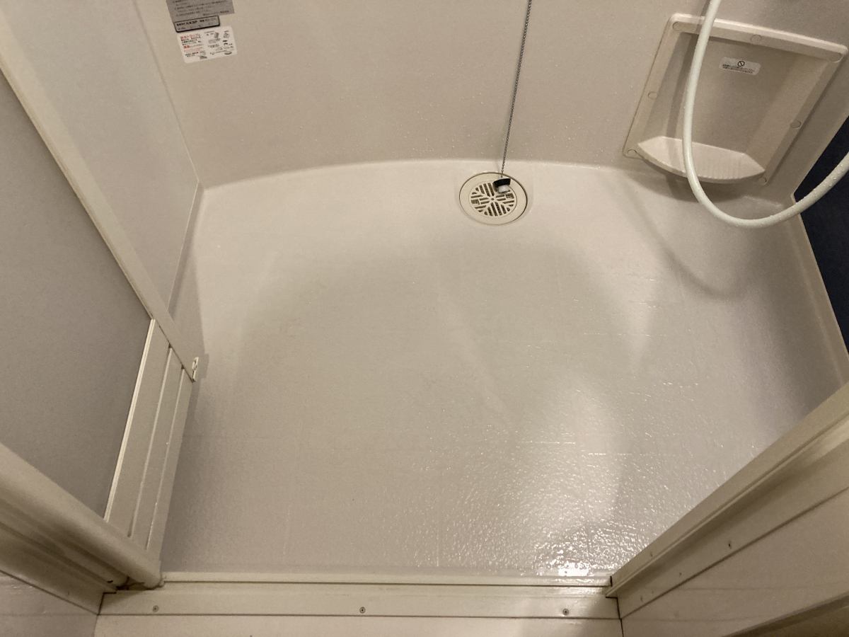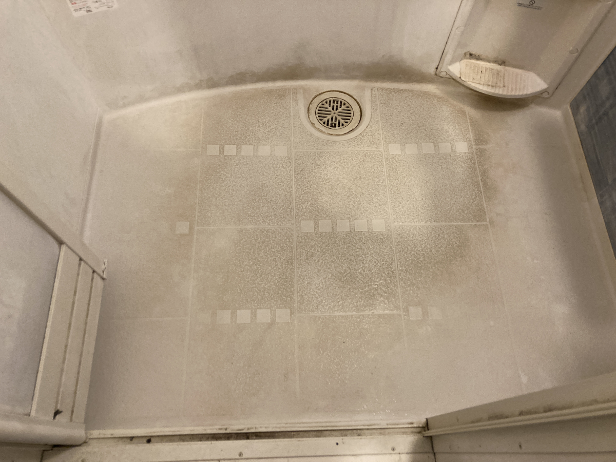 ボディーソープより石鹸を使うことが多いようで、シャワーで跳ねた皮脂や石鹼カスが至る所に付着していました。