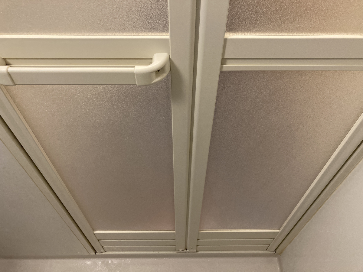 浴室の扉も汚れやすい箇所になります、こちらも石鹼カス汚れがびっちり付着していきます。