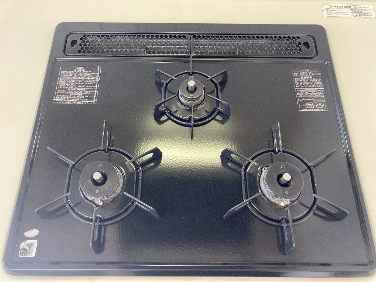 表面には油汚れがたっぷり付着しています、五徳やバーナーキャップは焦げ付き汚れが見られます。