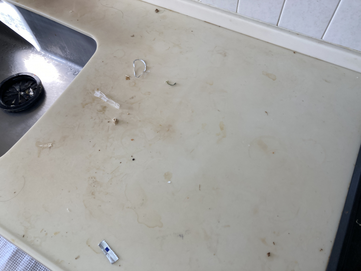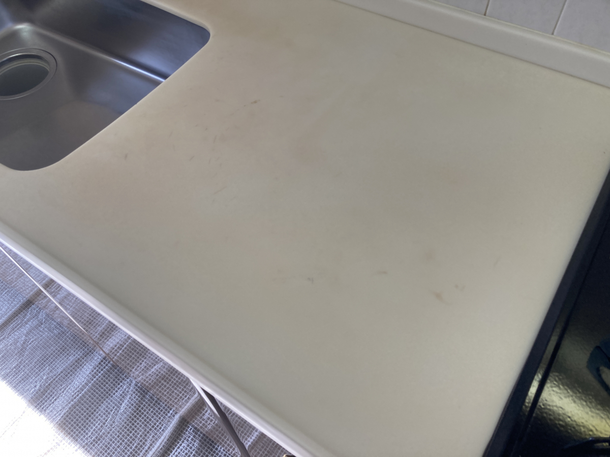 調理台やシンク回りはアルカリ性洗剤と研磨剤を使用し表面の汚れをこそげ落としていきます。