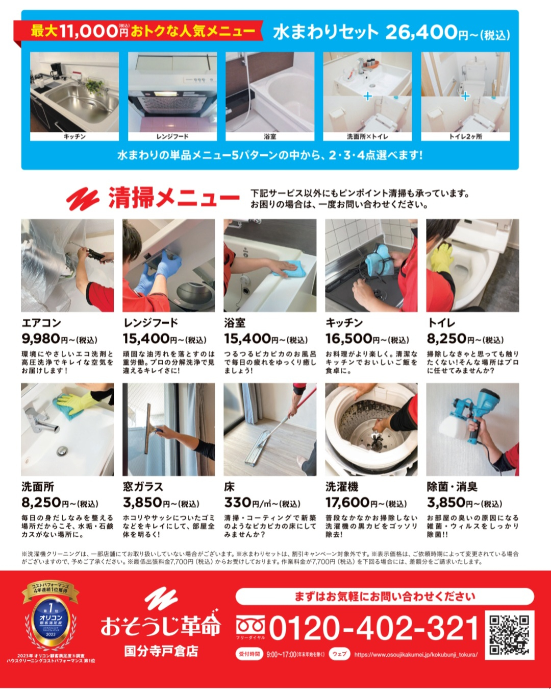 おそうじ革命 国分寺戸倉店では、お客様のご要望に合わせた、きめ細かなサービスとプロの清掃技術で、お客様のお悩みを解決いたします!