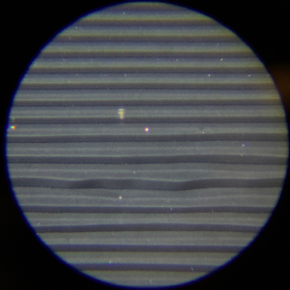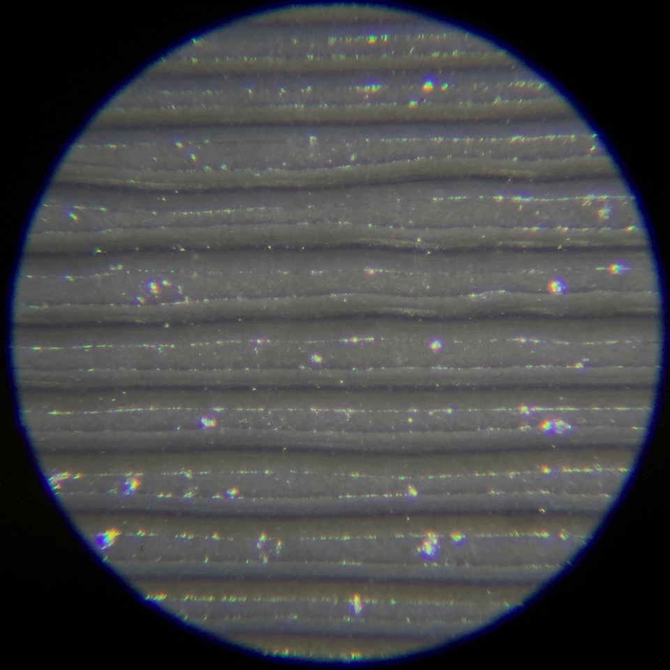 最初の写真は新しいレコード、次の写真は激安100円で入手した中古盤の表面を120倍のハンディ顕微鏡とiPhoneで拡大撮影したものです。