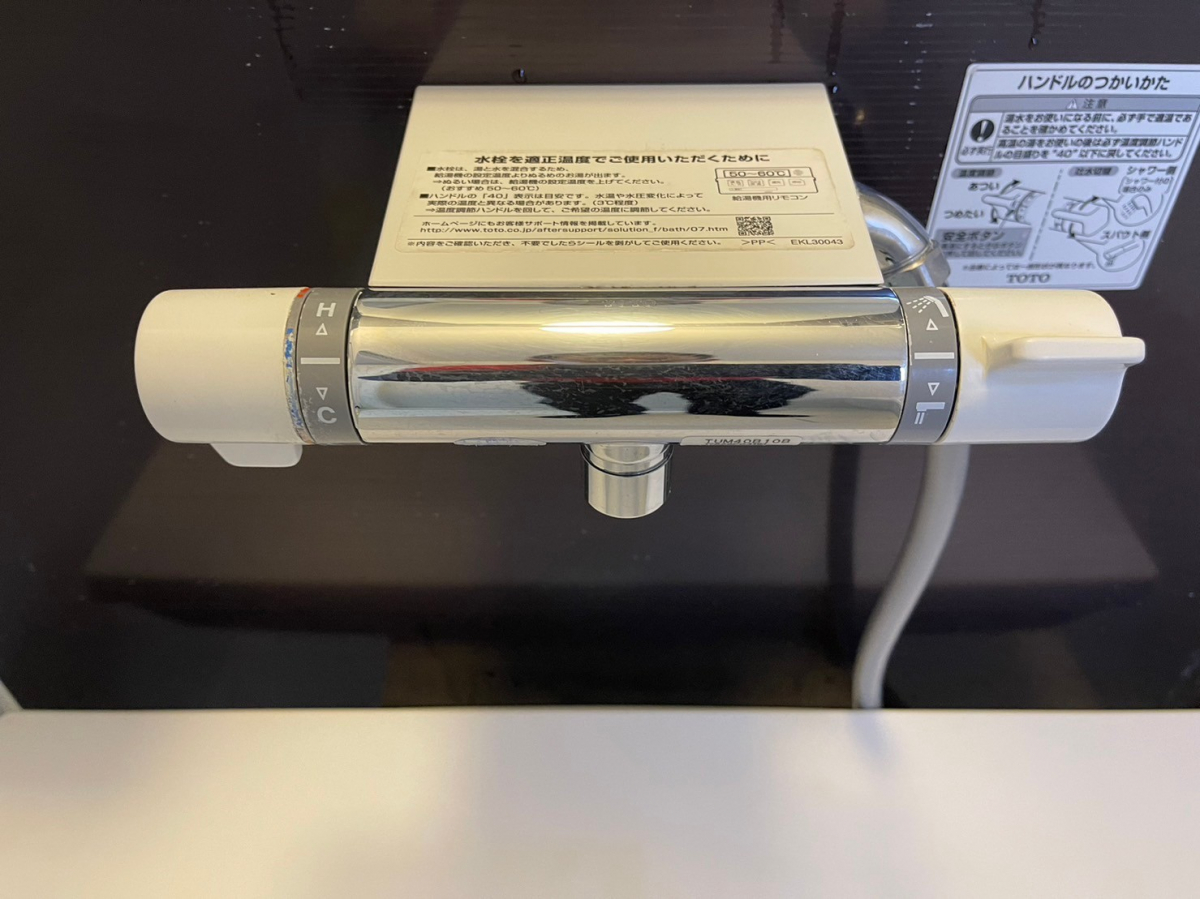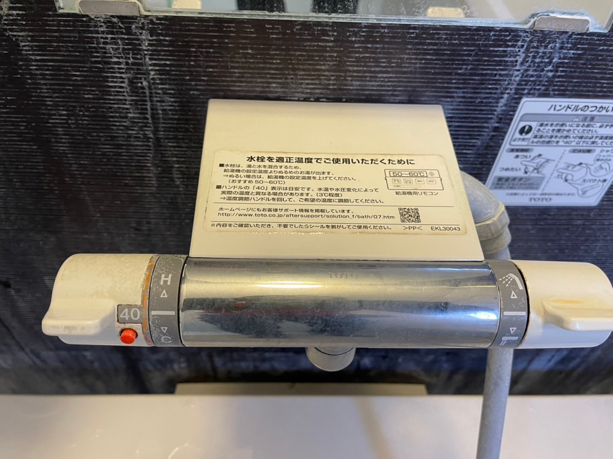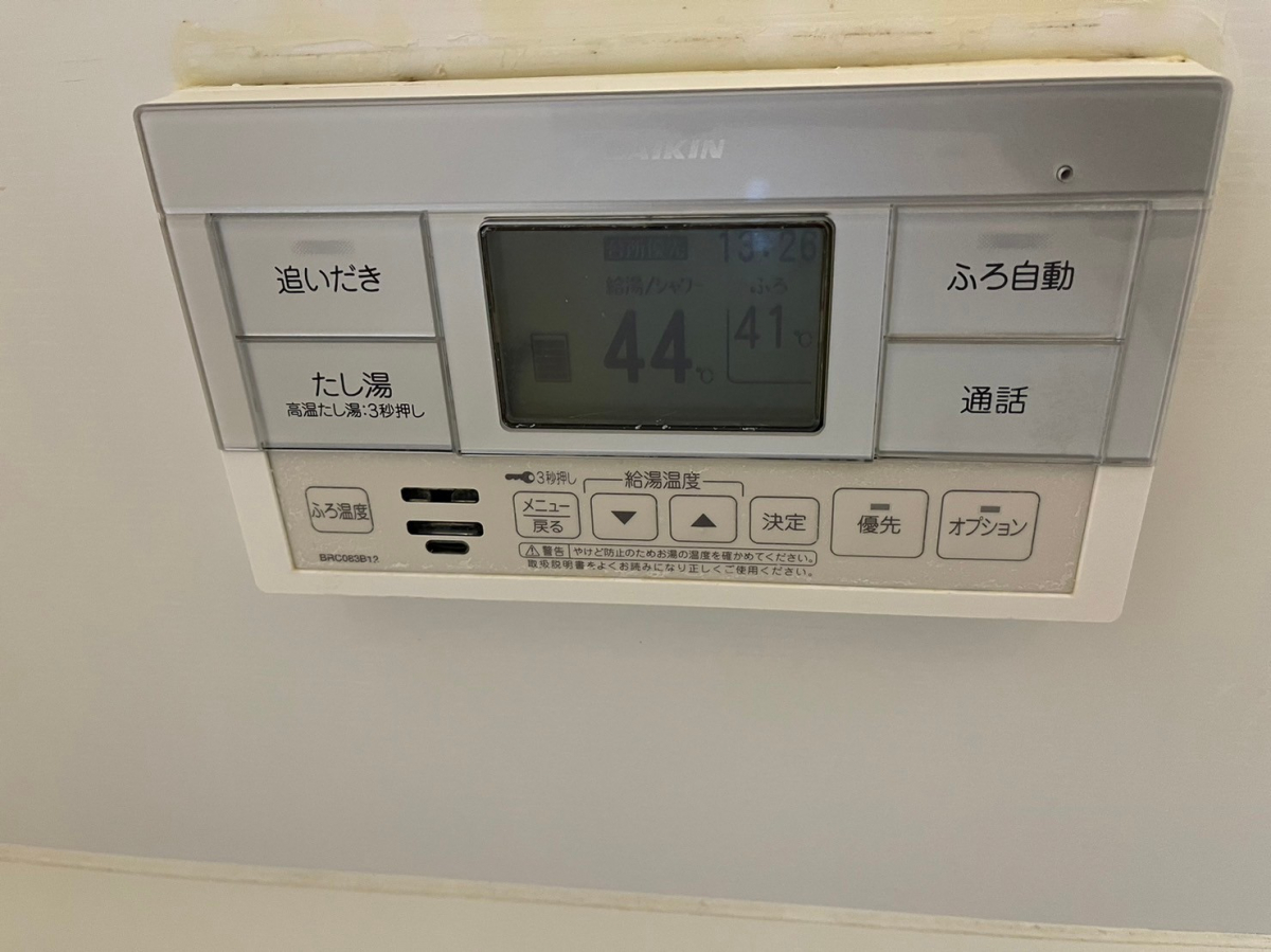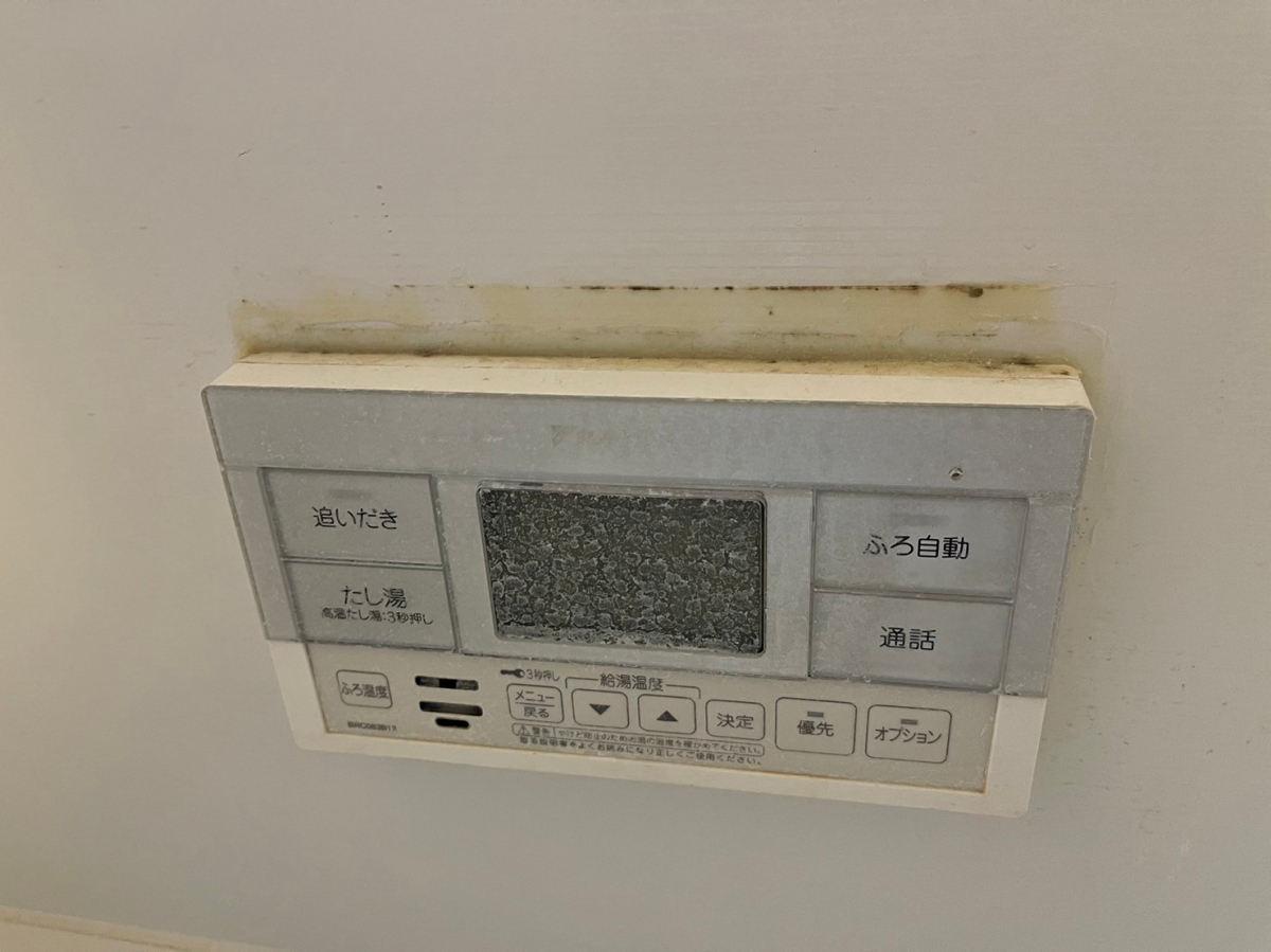 うろこ状に白くなってしまった浴室の給湯器リモコン。