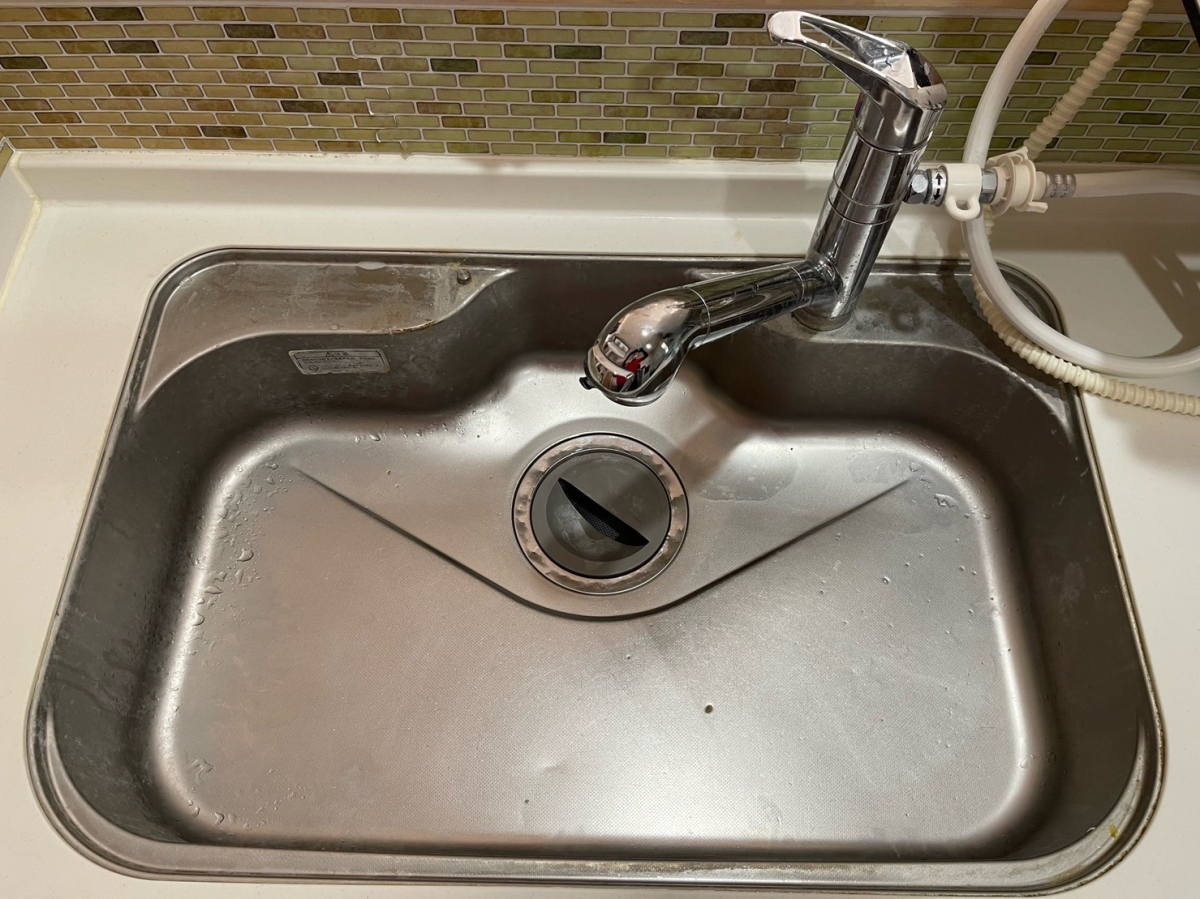こちらのカランもの汚れ、奥の壁の白色も水垢!カランも壁もお掃除したあとはきれいになって鏡のように反射しています。