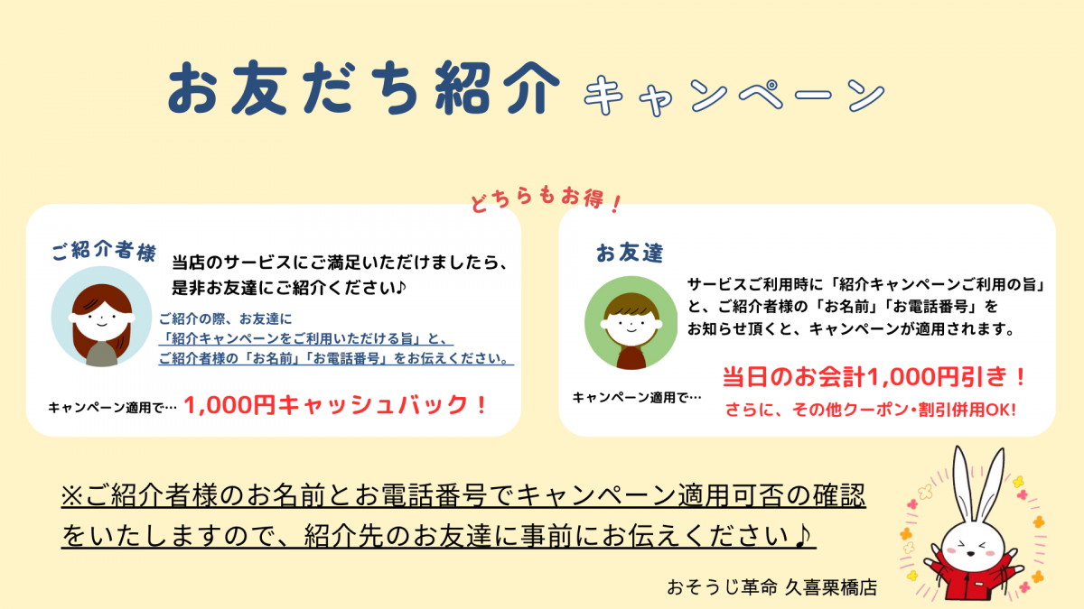 お得なキャンペーンでさらに多くのお客様におそうじ革命久喜栗橋店のサービスを体験して頂けたら幸いです。