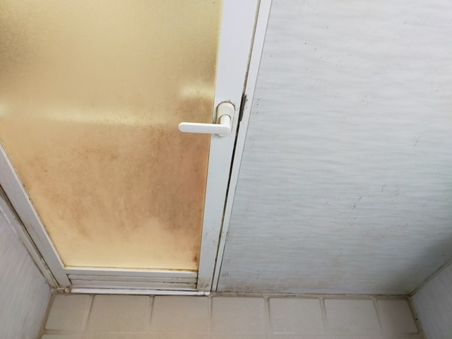 パッと見ただけでも石鹸カスとカビがたくさんあります!