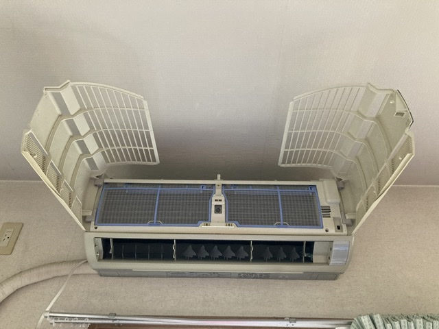 ほとんどの壁掛けエアコンは下から上にパカっと開ける形ですが、この形はとても珍しいですよね!