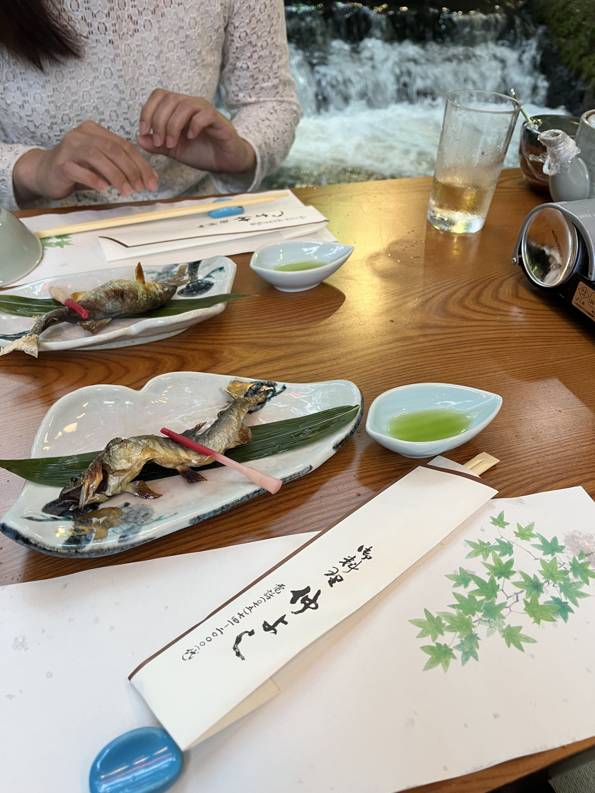 川床は少し肌寒いくらいで川の流れる音を聴きながら鮎の塩焼きをいただきました。
